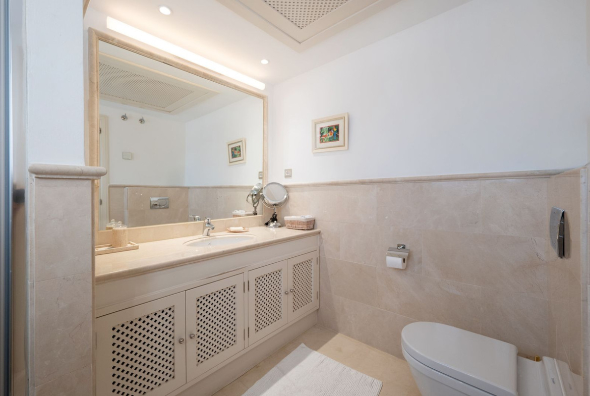 The townhouse includes a total of four bedrooms. Two bedrooms are located on the first floor, and two are in the basement. The master bedroom on the first floor boasts its own walk-in closet and en-suite bathroom. The adjacent bedroom also has its own bathroom. Both bedrooms offer stunning views of the sea and mountains.