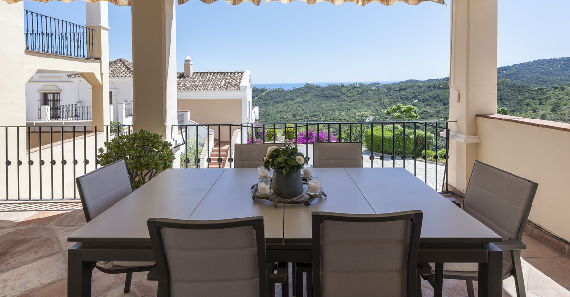 Set in the peaceful hills of Monte Mayor, this elegant four-bedroom townhouse offers a secure and scenic lifestyle just a short drive from the coast. Located in Benahavis, the property enjoys easy access to the A-7 coast road, putting Estepona and Guadalmina within 20 minutes by car. The area is popular with families and second-home owners who appreciate privacy, natural surroundings, and good connections to international schools, golf courses, and nearby beaches. You are also close to sports clubs, supermarkets, hospitals, and other essential services. The property is part of a gated community with 24-hour security, cameras, and communal facilities, including a garden, pool, and garage.