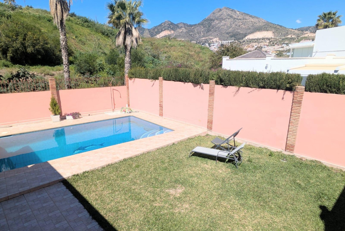 Eng.: Beautiful semi-detached house with a private pool and garden for sale in Benalmádena Costa. It has a constructed area of 241m², spread over three floors.