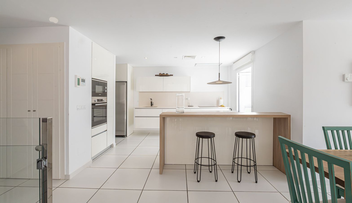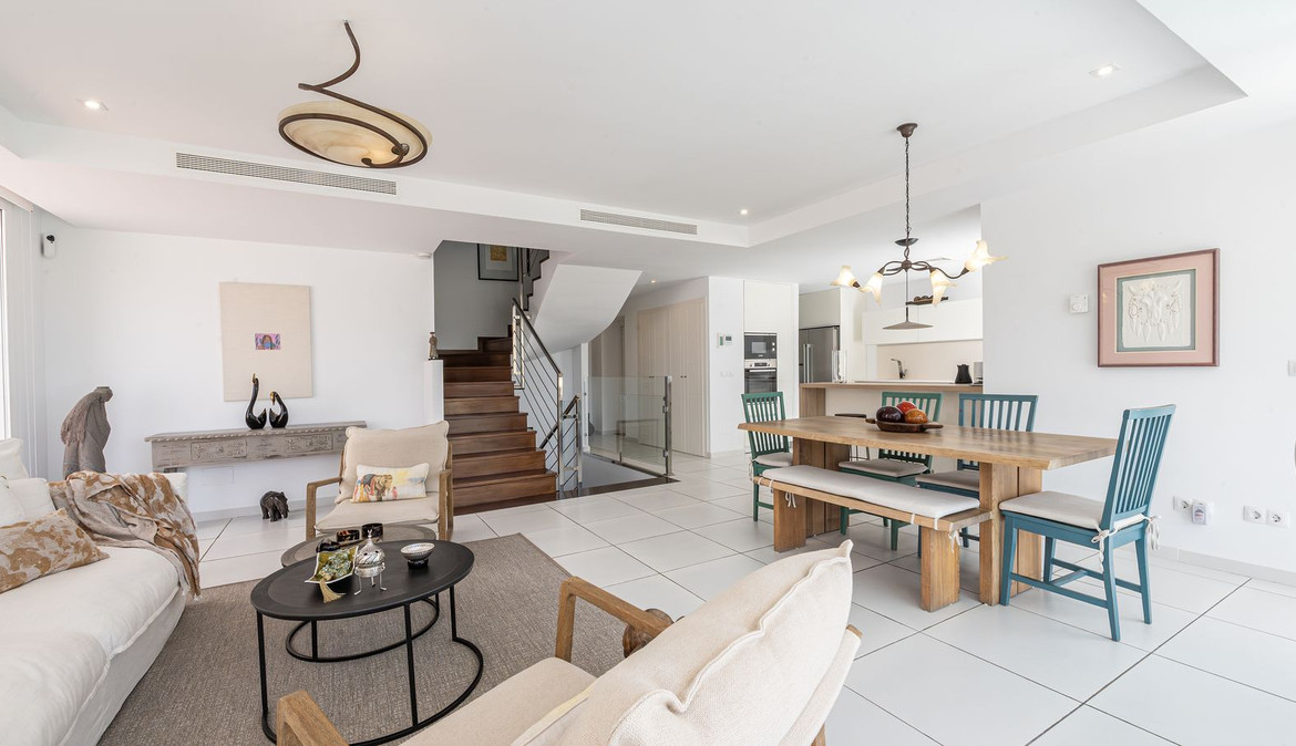 The villa is distributed over 3 levels, all connected by a private elevator. It has 4 bedrooms, all with en-suite bathrooms, plus a guest toilet. The master bedroom features a fantastic walk-in wardrobe, large terraces, a fully equipped kitchen, and a laundry room.