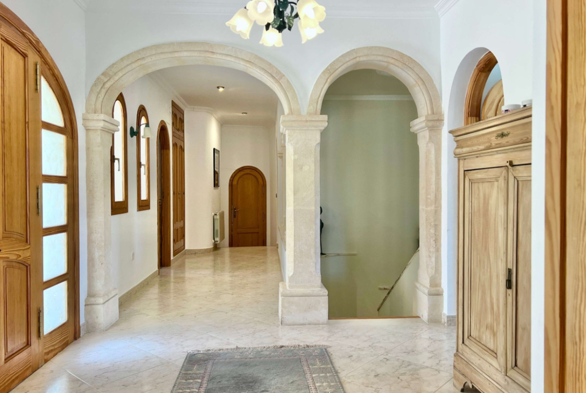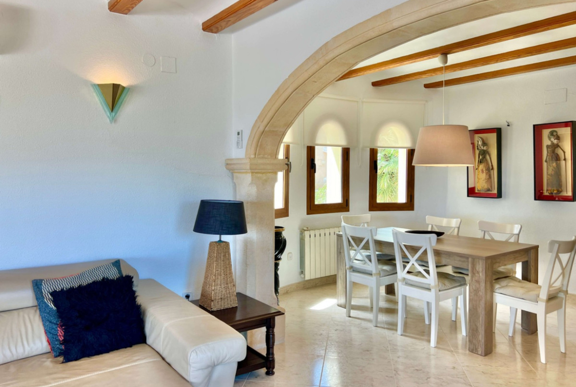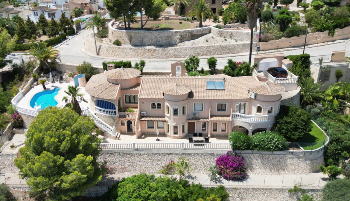 On the edge of a protected nature reserve, in an oasis of tranquility and with delightful views, you will find this villa in traditional Spanish style. The property consists of 2 levels and can be perfectly used as 2 separate living units. You can access the villa through the automatic sliding gate or the separate pedestrian entrance. The entrance features a spacious hallway, where the beautiful arches of the stairwell immediately catch the eye. From the entrance, there is direct access to the living area and the kitchen on one side, and the sleeping area on the other. The master bedroom, with its dressing area, has an en-suite bathroom. This luxurious bathroom is equipped with a large jacuzzi and offers a wonderful view of nature. Additionally, there is a second bedroom and bathroom. From the spacious and bright living room, divided into a dining room and lounge with a fireplace, you already have a view of the famous Ifach of Calpe! On this side of the villa, there is also the covered terrace and the swimming pool, surrounded by tropical plants and equipped with an outdoor shower and relaxation area. The lower level, accessible via an outdoor or indoor staircase, enjoys the expansive terrace, private garden, and laundry and storage spaces, and includes the separate apartment. This features a sitting area, open kitchen, two bedrooms, and two bathrooms. There is a private entrance, and the apartment can also be closed off from the upper floor. Even from here, you can enjoy privacy and views! A lot of attention has been paid to quality and energy saving. For instance, the outdoor terrace has been re-tiled. Thanks to the solar boiler, the property is extremely economical in consumption. In other words: this delightful villa is ready to move into and enjoy peace and sunshine.