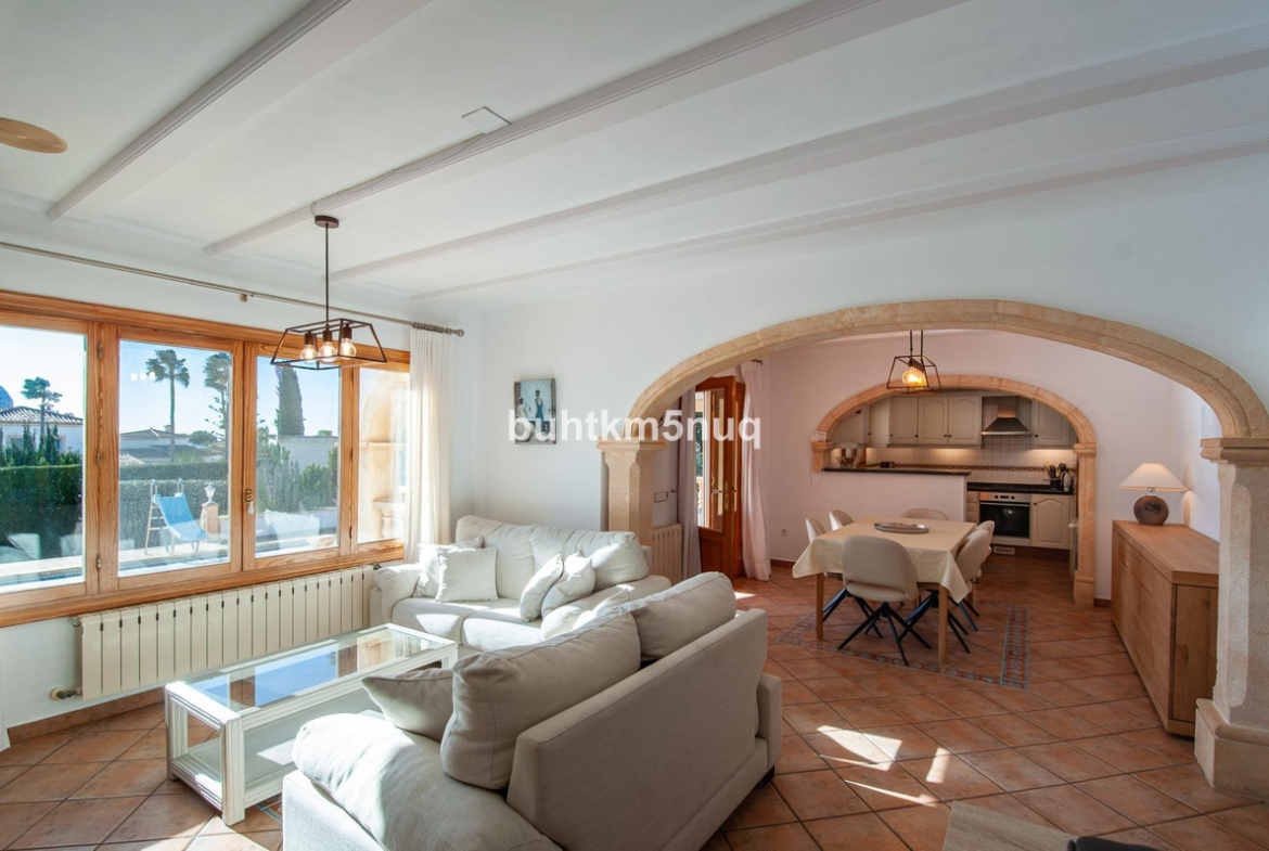 This beautiful property is located on a south-facing corner plot and offers excellent privacy, a large driveway with carport, and parking space for up to four cars, making it both comfortable and practical. The plot combines space, sunshine, and spectacular views of the Ifach and the sea, ideal for those who value peace and comfort.~~Inside, the property welcomes you with a spacious and light-filled living and dining area, seamlessly connected to an open-plan kitchen with ample storage space. From the living area, you can also enjoy stunning views of the Ifach, creating a particularly pleasant living experience. The property is equipped with air conditioning and double glazing, ensuring year-round comfort.~~On the ground floor, there are three bedrooms and two bathrooms, ideal for family and guests.~The upper floor is fully designed as a luxurious master suite with an en-suite bathroom, dressing room (walk-in closet), and a large private terrace. From here, you can enjoy breathtaking views of the Ifach and the sea, making this floor a true private oasis.~~Outside, the property offers everything needed to fully enjoy outdoor living. The large south-facing terrace overlooks the Ifach and features a fully equipped outdoor kitchen with barbecue. Adjacent to this is a separate space with a shower and toilet, ideal for use by the pool. The large heated swimming pool, complemented by an outdoor shower, is set within a perfectly maintained garden that radiates tranquility and maximum privacy.~~Via the large driveway with carport and automatic gate, there is ample parking for four cars, ideal for family and guests.~Beneath the property is a large, well-maintained basement with a separate entrance, accessible via another access point. This space is ideal for storing scooters or motorcycles, but also offers many other possible uses.~~A complete and stylish property where indoor comfort and outdoor living come together harmoniously, with sun, space, privacy, and views as absolute highlights.