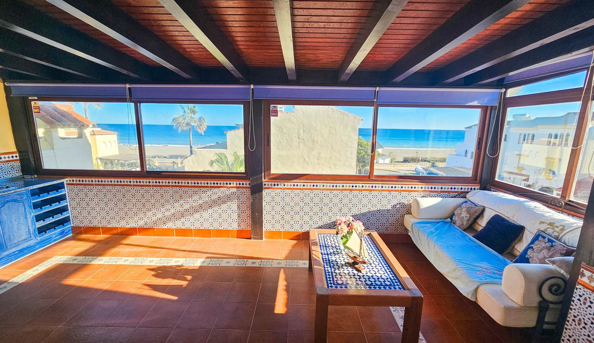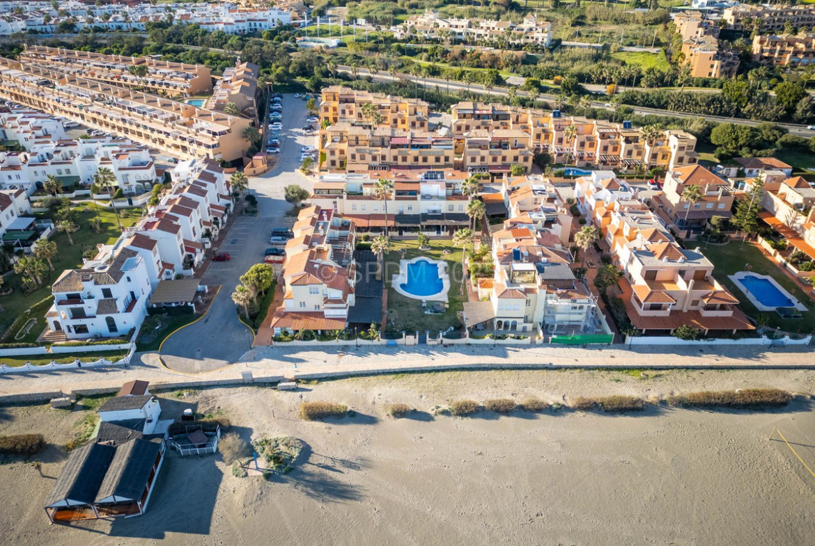 This magnificent property is located in a frontline beach development. It is ideally located in a quiet area and yet is just a few minutes from the town of Sabinillas with all its amenities. The semi-detached house is located in a well-maintained private and quiet development with beautiful gardens and communal pool. In addition to a public paddle tennis court complex right next door. The development is located in Marina de Casares, between Sabinillas and Estepona, with easy access to the motorway, 5 minutes drive from both towns and the attractive Puerto de la Duquesa where there are all kinds of shops and leisure venues. Very close to 3 different beaches with good restaurants and a wonderful beach club, one of them a dog beach, and very close to the new Estepona Hospital. There are 5 golf courses within a 5-minute drive, one of them being the well-known Finca Cortesin, of great prestige and home to the Volvo Masters for some years.