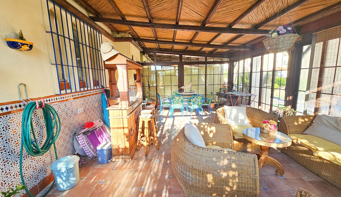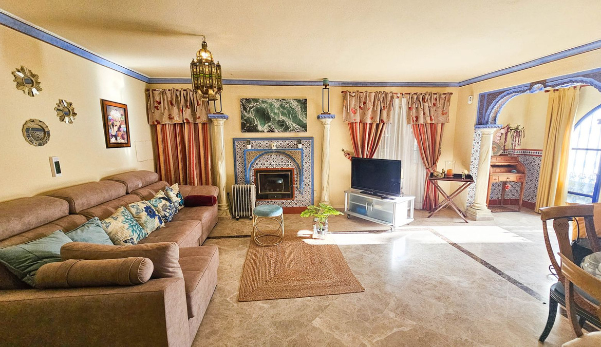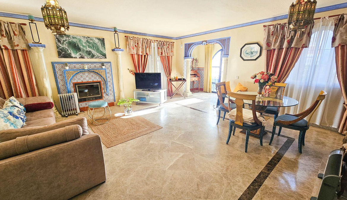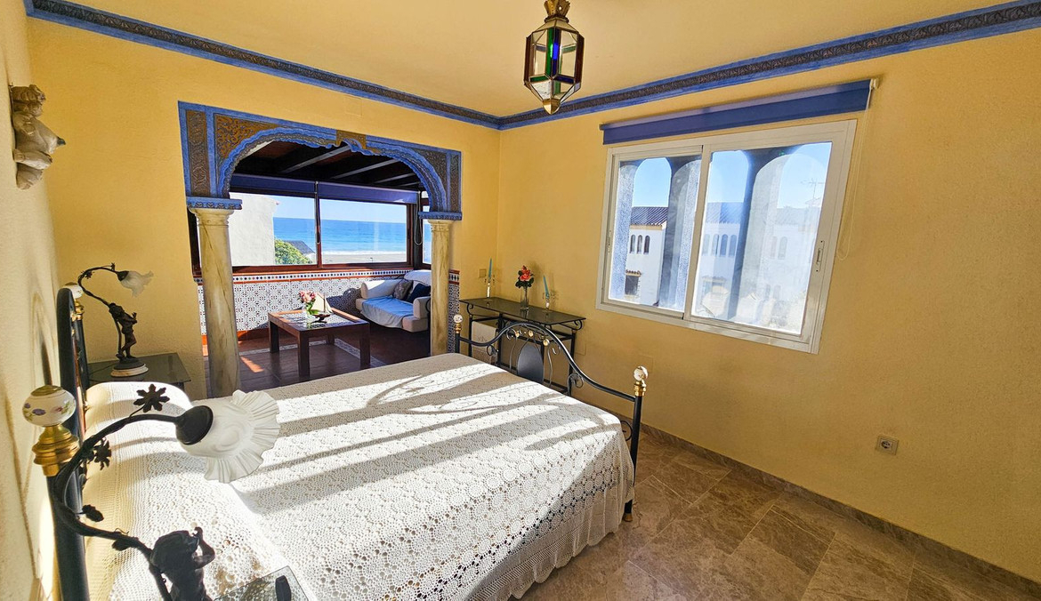 Beautiful 4 bedroom, 3 bathroom, 1 toilet corner townhouse with private exterior glazed terraces in Marina de Casares, close to the beautiful blue flag sandy beach and many shops, bars and restaurants. The property boasts the purest Andalusian style with marble floors, typical tiles and arabesque details. It is distributed over two levels with panoramic sea views. On the ground floor we find a spacious living room with fireplace, a guest toilet, a large independent kitchen with dining area and laundry area. And, most importantly, access to a huge outside terrace with a beautiful fountain. This beautiful outdoor space is walled, giving it a great feeling of privacy. The perfect place to spend the whole day and relax. There is a direct exit to the pool and common areas, very practical to go back and forth from the pool to the house throughout the day. On the upper floor we find 4 bedrooms and 3 full bathrooms. The master bedroom has an en-suite bathroom with jacuzzi, and a huge terrace with panoramic views of the sea and the beach. All bedrooms have fitted wardrobes and one of them also has its own terrace with side sea views. This small gated community has beautiful communal areas, gardens and swimming pool, whilst maintaining very reasonable community fees. In addition, it has outdoor parking areas and can be purchased furnished as an option.