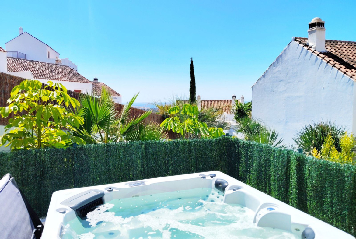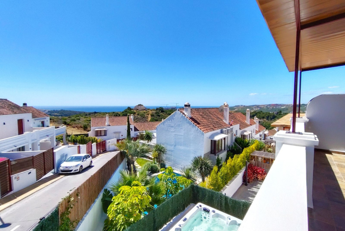 Located next to the Finca Cortesín Golf Course, one of the most prestigious golf courses in Spain, it has hosted numerous high-profile events, including the Volvo World Match Play Championship three times and the 2023 Solheim Cup. Just a 7-minute drive from the beach and San Luis de Sabinillas with its picturesque Puerto de la Duquesa. Between Estepona and Sotogrande, both a 12-minute drive away. This house is located on a corner, enjoying a large, south-facing private plot. It is distributed over 3 floors. The ground floor features a spacious, bright living room with a cozy fireplace and access to the large covered terrace, a guest toilet, and a beautiful dining room connected to the open-plan, fully equipped kitchen with excellent finishes and a modern and functional style. On the upper floor there are two bedrooms with en-suite bathrooms. The master bedroom features high ceilings, a dressing area, and beautiful partial sea views. Its bathroom also has a shower and a whirlpool bathtub. The second bedroom has an en-suite bathroom with a bathtub and access to the large covered terrace with beautiful panoramic sea views. On the ground floor there are two large bedrooms, a spacious bathroom with a shower, and a spacious home theater. The outdoor area includes a car access with an electromechanical gate and ample covered parking, a large garden area with the possibility of building a swimming pool, a covered terrace with recently installed awnings, a Jacuzzi area, and automatic irrigation. The house has photovoltaic solar panels, an alarm system and outdoor video surveillance cameras, air conditioning throughout the house, and underfloor heating in the first-floor bathrooms. The house was updated and renovated in 2023, so the kitchen and all non-structural elements of the property were newly installed. GREAT OPPORTUNITY TO HAVE YOUR HOME NEXT TO THE PRESTIGIOUS FINCA CORTESIN GOLF COURSE!!!