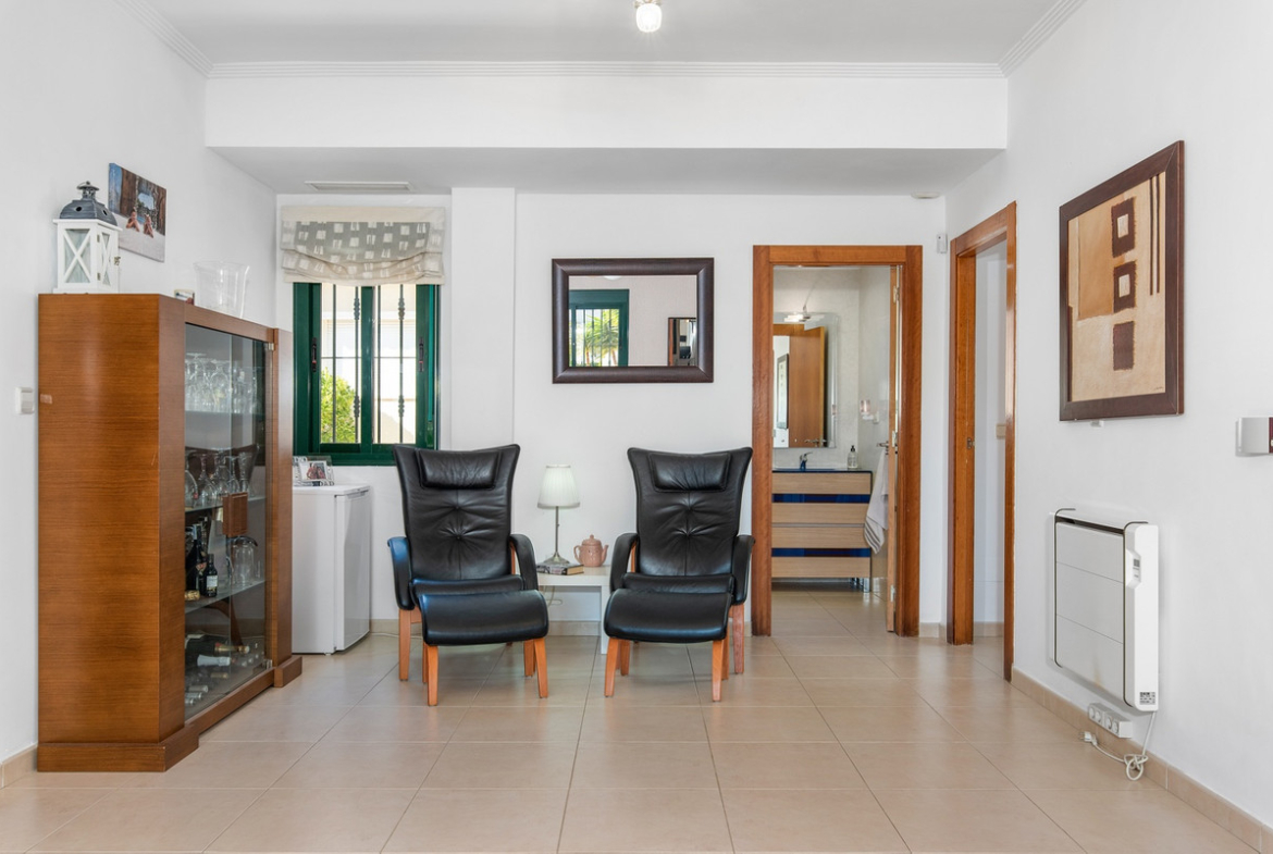 Outdoor areaThe villa is set on a south facing plot of 546 sqm. It has a lovely tiled garden where you can find a swimming pool and a lot of space for outdoor seating areas and sun beds. By the entrance there is also a large covered terrace. At the back of the house there is a large parking area with space for several cars. The villa also has a large terrace in the first floor with amazing views over the salt lakes and Torrevieja.