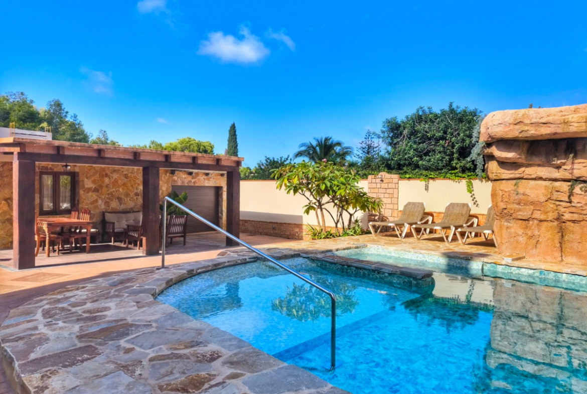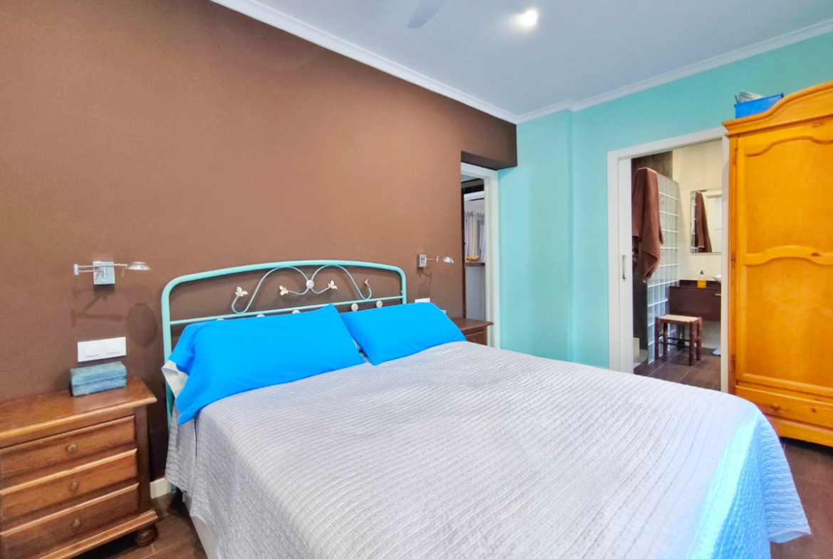 On the lower part of the plot, there are two additional apartments, each with its own kitchenette, living room, bedroom and bathroom. Both share a spectacular outdoor area with a beach-style pool, natural waterfall, jacuzzi, waterbed and solarium. In addition, each apartment has a covered Mediterranean-style chill out area, ideal for relaxing and enjoying the surroundings.