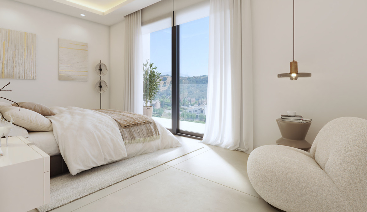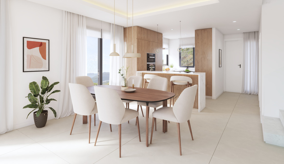 The villas located on the corners have their own garden and private pool with salt chlorination. The central villas have the pool located on the third floor of the house. The open and functional spaces are undoubtedly the protagonists of the homes, they connect us with the terraces and their wonderful views of the sea, golf course and mountains.
