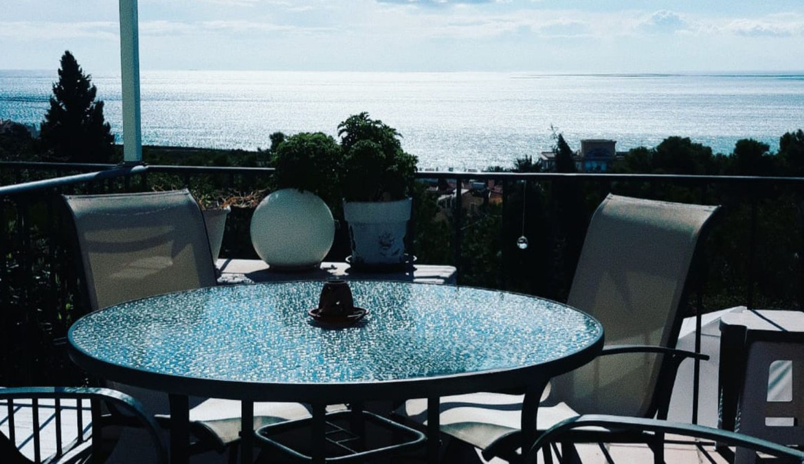 The property features a bright and comfortable living room with fireplace, a fully equipped modern kitchen with high-end appliances, and several outdoor spaces perfect for enjoying the Mediterranean lifestyle. One of the highlights is the sunny terrace with sea views, ideal for outdoor dining and relaxing. There is also a covered porch area with space for entertaining, as well as private outdoor areas that provide both comfort and privacy.