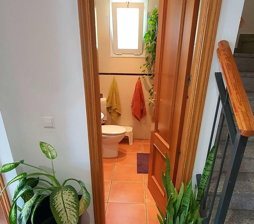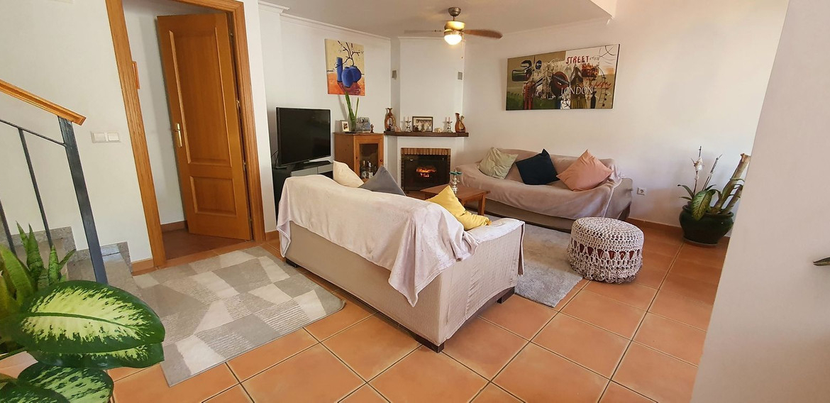 At the entrance, a welcoming terrace leads you up just two steps to the main door, opening into a spacious and inviting living room complete with an atmospheric fireplace. The dining area conveniently connects to the kitchen, offering the potential to create a modern open-plan kitchen and lounge. A guest bathroom is also located on this floor.