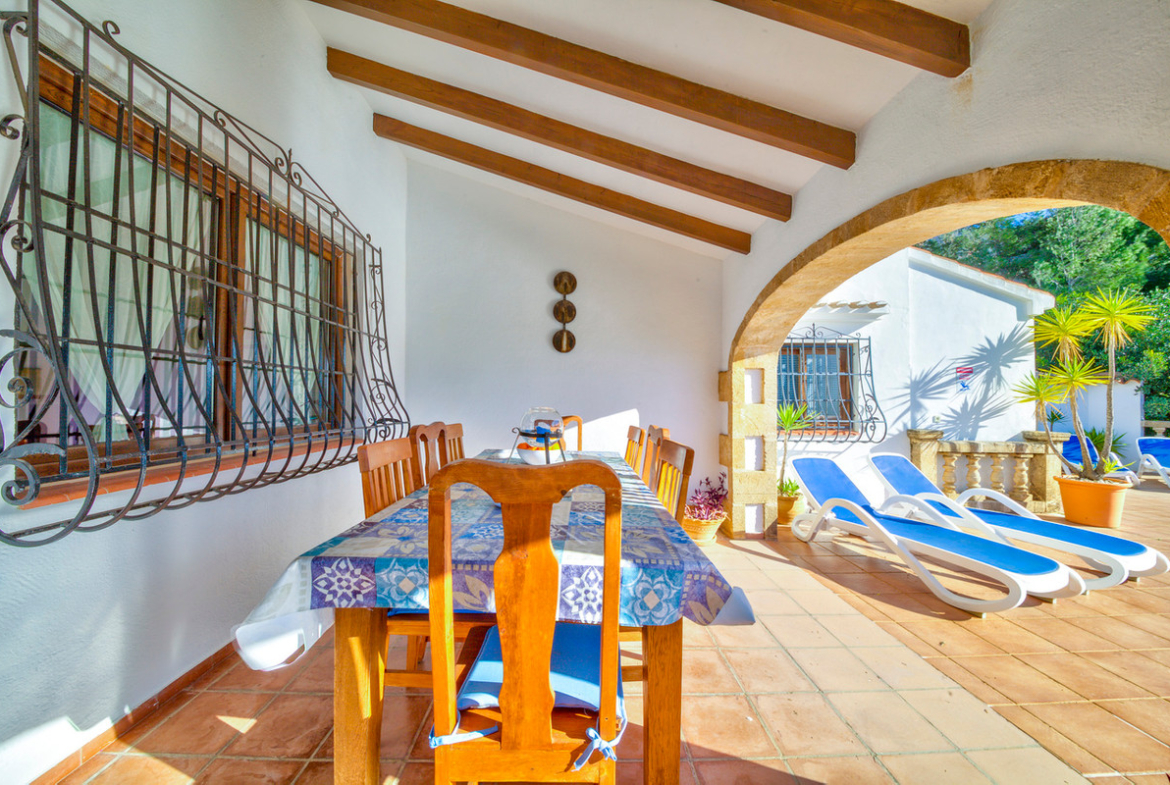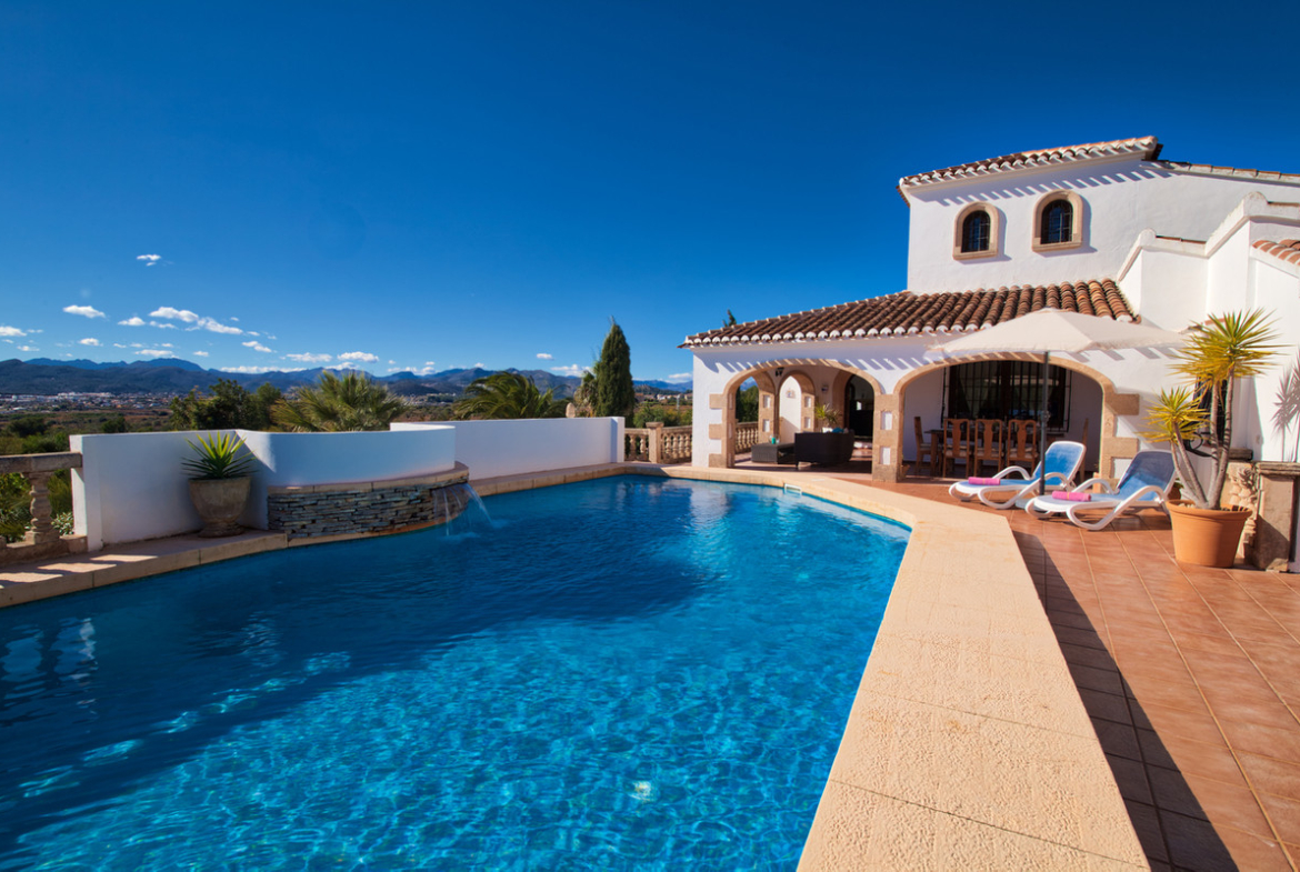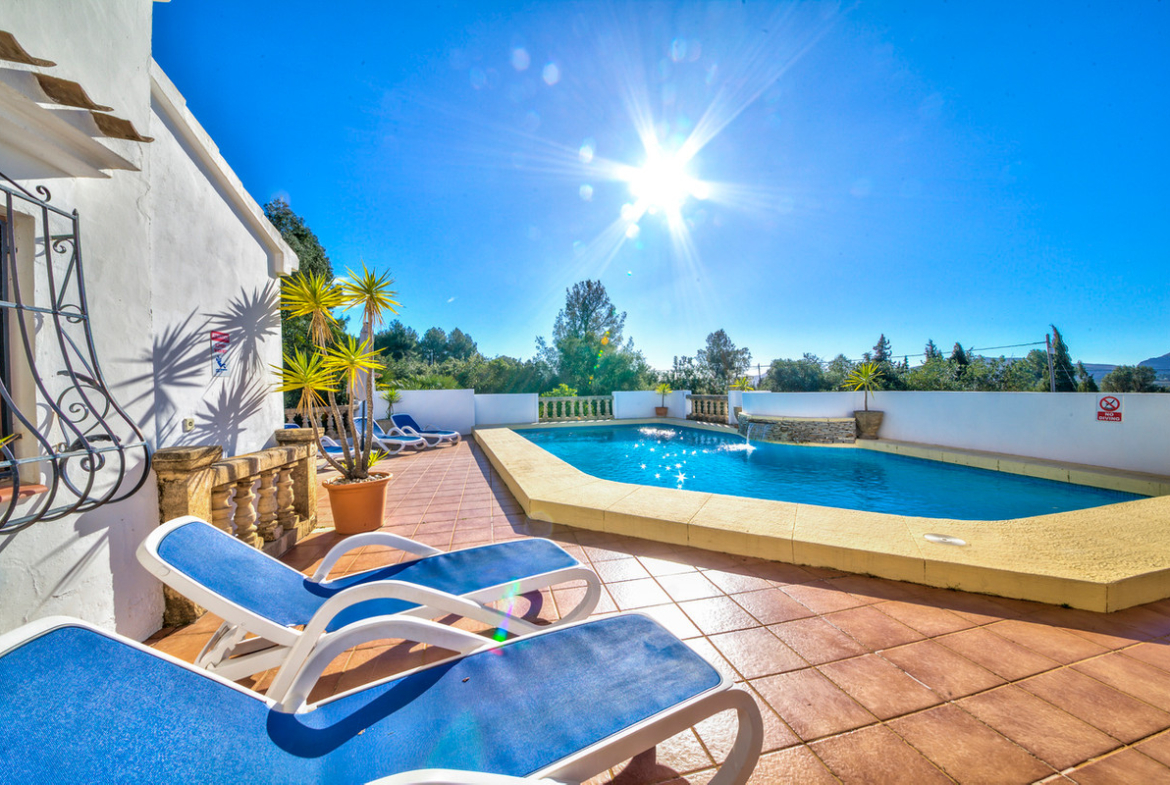 Los Arcos is a traditional Spanish styled villa with gorgeous valley views, 4 bedrooms, 2 bathrooms, summer kitchen and 2 terraces. The villa is situated 15 minutes drive from both Javea and Denia with everything they have to offer. You arrive at the villa where there is ample parking for 3 cars, up a short flight of stairs to the main terrace. Behind the pool is a summer kitchen and bar area equipped with fridge, gas BBQ, sink with a small dining table and bar stools. A great area that will certainly be the centre of the food and drink activities. Next to the summer kitchen is a shaded area with enough space for 2 sun loungers or chairs providing shade from the midday sun, reading a book or a great shaded area for the children to play. The pool is a modern design with fountain and plenty of space for the sun worshippers.Moving towards the front of the villa across the terrace is a dining table for 8 and outdoor seating with coffee table for 5 people. heading into the villa you arrive in the spacious dining / living room with the large wood burner and fire place ideal for winter comfort. The dining inside the property is for 6 people and is an attractive addition to the open plan living dining area. Next to the dining area is the large kitchen with breakfast bar for 4 people, large fridge freezer and dishwasher. Adjacent to the kitchen is an office table and work space to keep in touch with the work. You move up a flight of stairs to the “tower bedroom” which is perfectly set up with 2 single beds.. All bedrooms benefit from air-conditioning.On the other side of the living room is a short passageway to the other 3 bedrooms and the family bathroom. The bedrooms are made up of a large master bedroom with en-suite walk in shower room with hot and cold air-conditioning. The other 2 bedrooms are a twin and double with use of the shared family bathroom and both benefiting from hot and cold air-conditioning.The villa is ideally placed under the Montgo mountain and with easy access to both Javea and Denia, and just a 5 minute drive to the renowned La Sella golf course, while for tennis aficianados there is a court for hire just across the road.