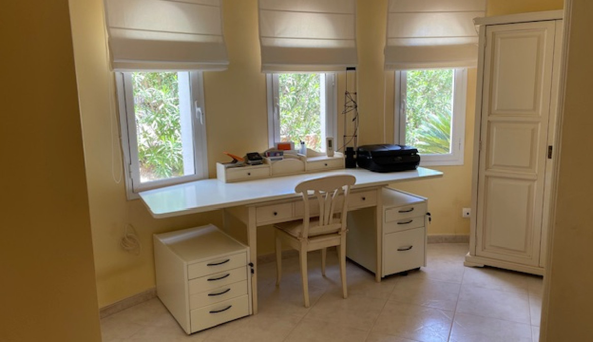 Also nestling under the palms next to the pool is a fully equipped outdoor entertaining and dining area with barbecue, outdoor kitchen + shower. More terraced gardens with palms, olive trees and exotic shrubs lie beyond and lead to a guest apartment in the gardens.
