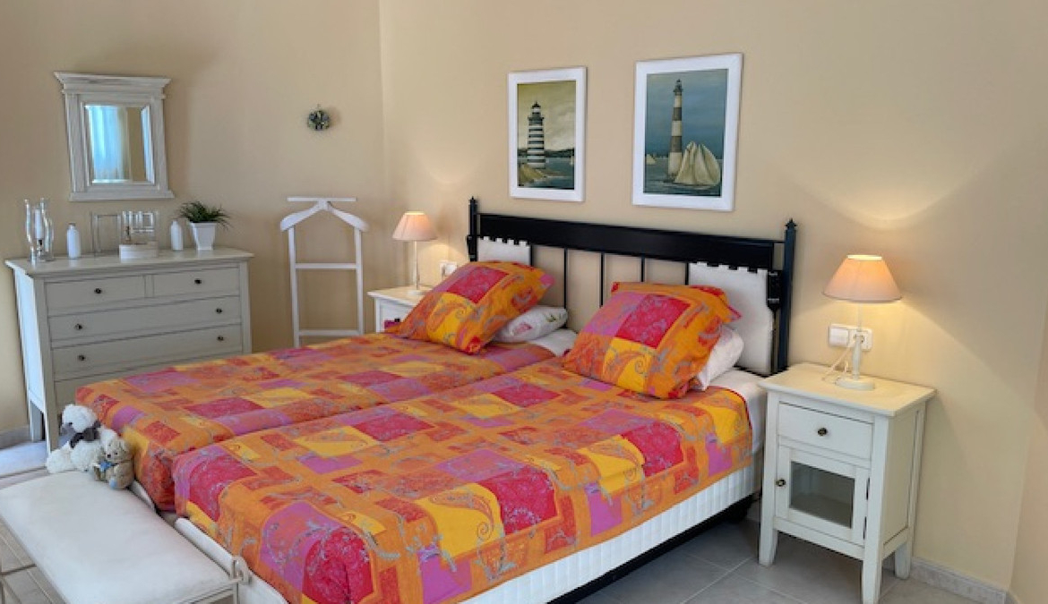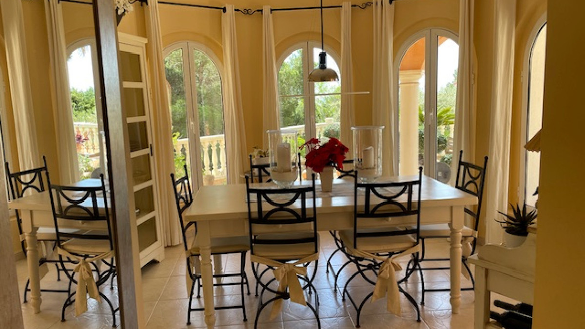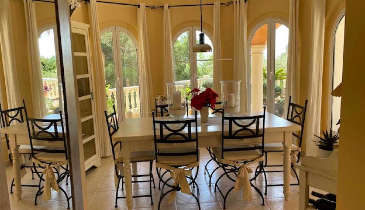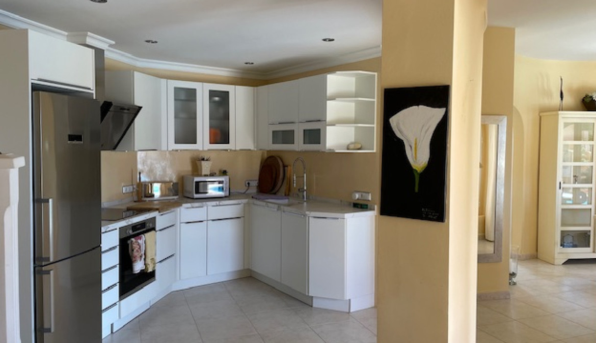 On the ground floor is a hallway leading to the spacious lounge with views to the pool and the sea beyond. A stylish open plan fitted kitchen with Bosch appliances leads off to a light, elegant dining room that also benefits from the wonderful views.