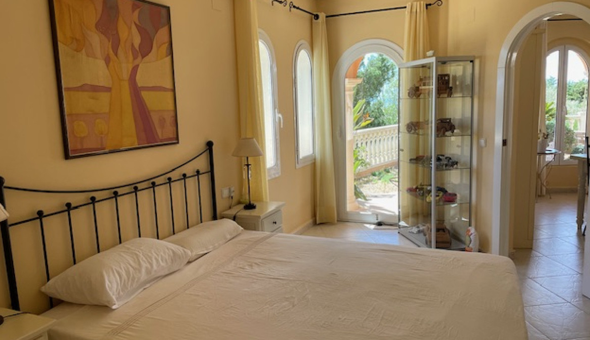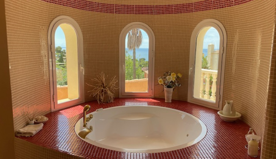 A curved stairway leads from the hallway up to the master suite with breathtaking views over the pool and gardens to the blue waters of the Mediterranean. The suite has a large roof terrace, where the waterfall starts it's descent to the swimming pool below, and has a luxurious ensuite bathroom with twin basins, shower and a circular jacuzzi bath offering more relaxing seaviews.