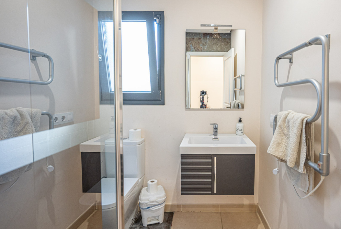 This terraced house is located on the outskirts of the historic center of Jávea, which to this day retains its medieval appearance. This makes it a unique network of narrow streets with southern-looking white facades and floral decorations to stroll through. You will also find many cozy restaurants and quaint stores. Also all amenities such as supermarkets, medical center, schools, restaurants, etc. are within walking distance. The house consists of 4 floors. The first floor is set up as a commercial office and has a separate entrance. The second floor consists of a large living-dining room with balcony, a kitchen, two double bedrooms one with en suite bathroom and a separate bathroom. There is also an interior terrace for outdoor dining. On the second floor we again find the same layout. Here there is a second living-dining room, a kitchen, two double bedrooms, one with en suite bathroom and a separate bathroom. The third floor consists of a large room that could be used as a 5th bedroom, office, yoga studio, gym, etc. Also here is a separate bathroom with toilet and shower. Through the third floor we enter the spacious roof terrace which offers beautiful views of the Montgó, the historic center of Jávea and the sea. From all the bedrooms there is also a view of the Montgó. Moreover, you never have to look for parking in the center because the house has a huge garage that fits up to 4 cars. The property has a separate electricity and water supply for each floor, making it possible to split the rooms into 2 independent apartments.