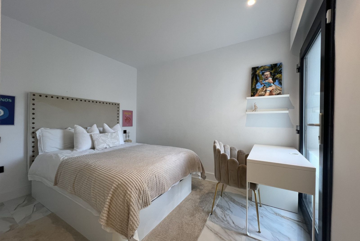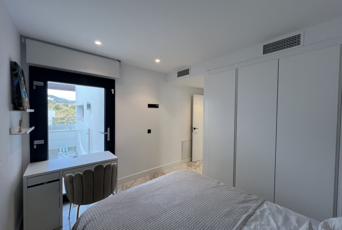 The upper floor comprises the master bedroom with built-in wardrobes and en-suite bathroom, as well as a second bedroom, also with fitted wardrobes and its own en-suite bathroom. From this level there is access to a spacious roof terrace with open panoramic views.