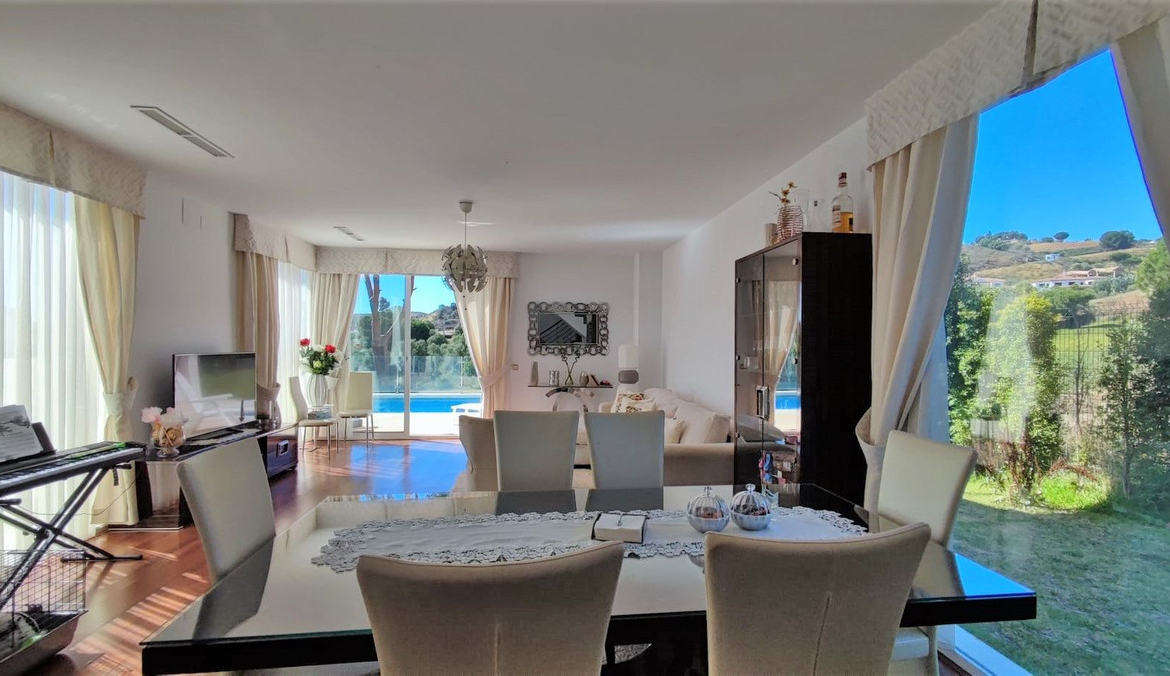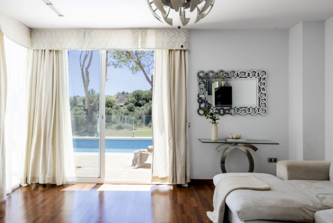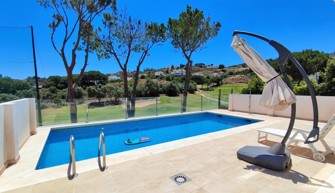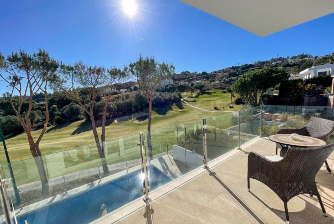 Set on a privileged golf front position in a quiet cul-de-sac street in the very heart of la Cala Golf resort, this superb detached villa enjoys sun all day and stunning golf views. Built in 2017 with a contemporary look, the villa benefits from great quality specifications, modern and open plan layout and the best possible natural light. The villa offers expansive open and covered terrace areas, as well as spacious indoor living space including 4 bedrooms and 3 bathrooms, a modern kitchen and laundryroom with Siemens appliances and living- dining area that offers an open plan concept. The living area and kitchen access directly to the sunny terrace overlooking the golf and to the superb swimming pool, which is the perfect spot to enjoy the true Costa de Sol outdoor living style.