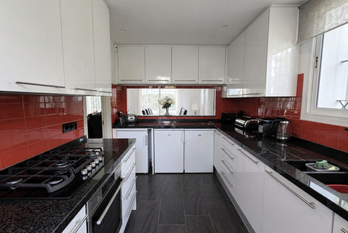The main living level features a bright and spacious open-plan living and dining area with French doors opening onto a large sea-view terrace—ideal for al fresco dining while taking in the coastal scenery. This floor also offers a fully fitted kitchen with a separate laundry area, as well as a convenient guest toilet.