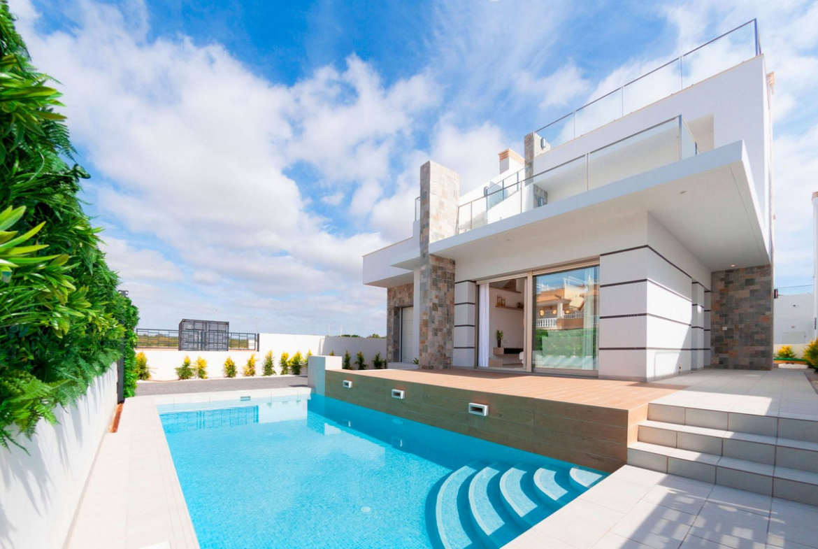 We are proud to present to you this Fantastic Detached Villa which is only 900m from the beaches of Los Alcazares and walking distance to all amenities. The property consists of 4 bedrooms, as one is converted from the garage to the 4th bedroom, 3 bathrooms, spacious living/dining area with a modern open plan kitchen. From the living area you will find sliding windows that lead you to the sunny terraced areas and private swimming pool. Each floor offers private terraces with open views and also a large roof solarium with jacuzzi, sauna and pergola