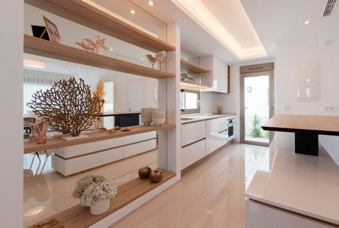 Los Alcázares is a beautiful coastal town full of palm trees and beautiful beaches. You will find all the necessary services, such as many good restaurants, tapas bars, cafes and supermarkets. In the calm waters of the Mar Menor you can practice water sports all year round and enjoy the beautiful beaches. Dos Mares Shopping Center is a 10-minute drive away. The large Zenia Boulevard shopping center with its 130 fashion stores is a 20-minute drive away. The natural parks of Cabo de Palos and Callblanque are a 20-minute drive away.