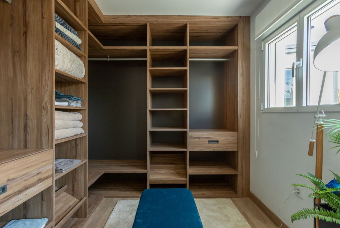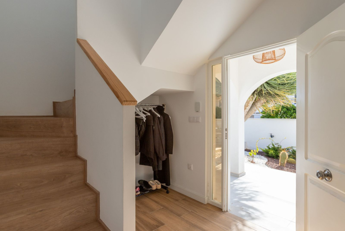 On the ground floor of the villa there is a spacious bedroom with a walk-in closet, an open living-dining area with a fully equipped kitchen, and a spacious bathroom with a washing machine and dryer. From the dining area you can access the chill-out area in the backyard, where you can of course enjoy the sun, barbecue, and swim in your own heated swimming pool. There is also a wood-fired sauna in the backyard. In the front yard there is parking space behind an electric gate, as well as a closed garage.