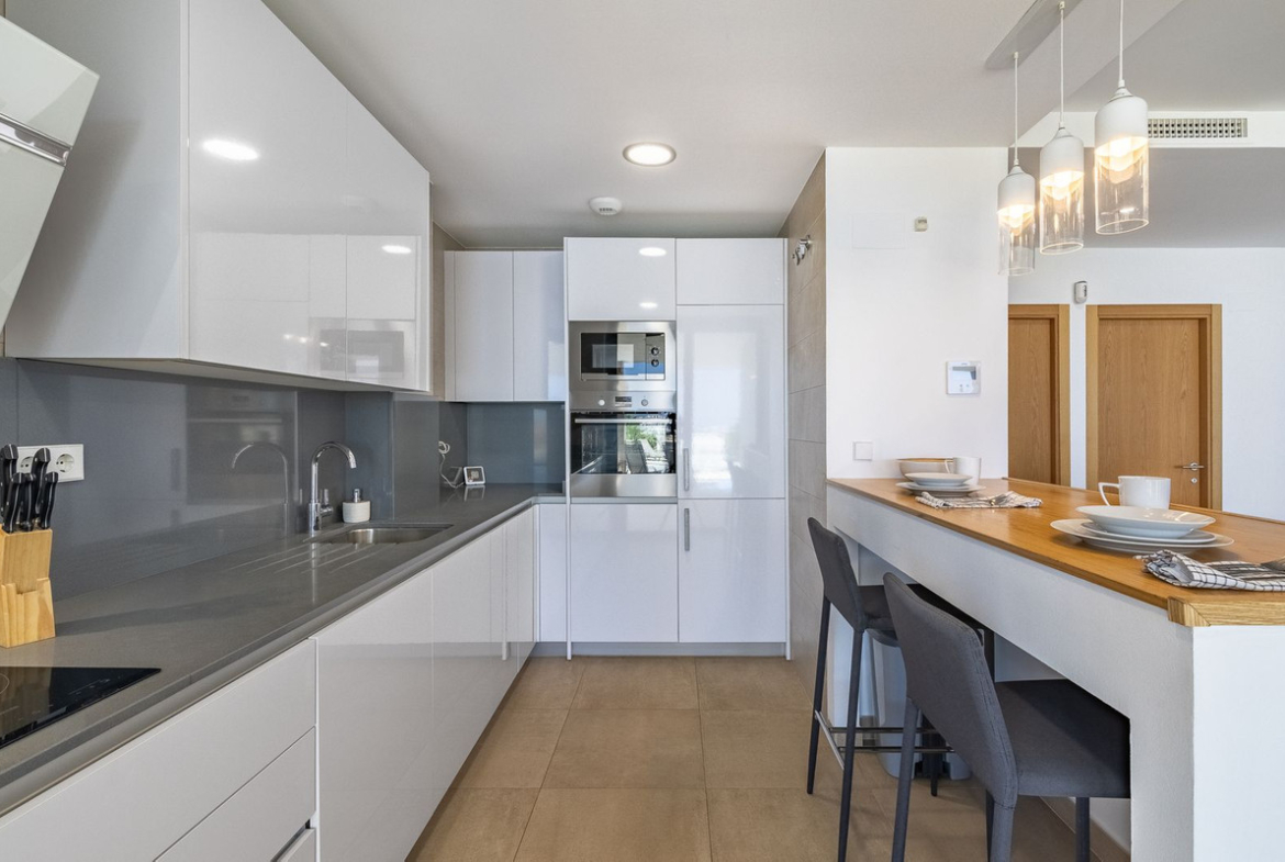 The heart of the home is a bright living-dining room, flooded with natural light through its impressive floor-to-ceiling windows framing panoramic sea views. This space flows seamlessly into the fully equipped open-plan kitchen, ready for immediate use.