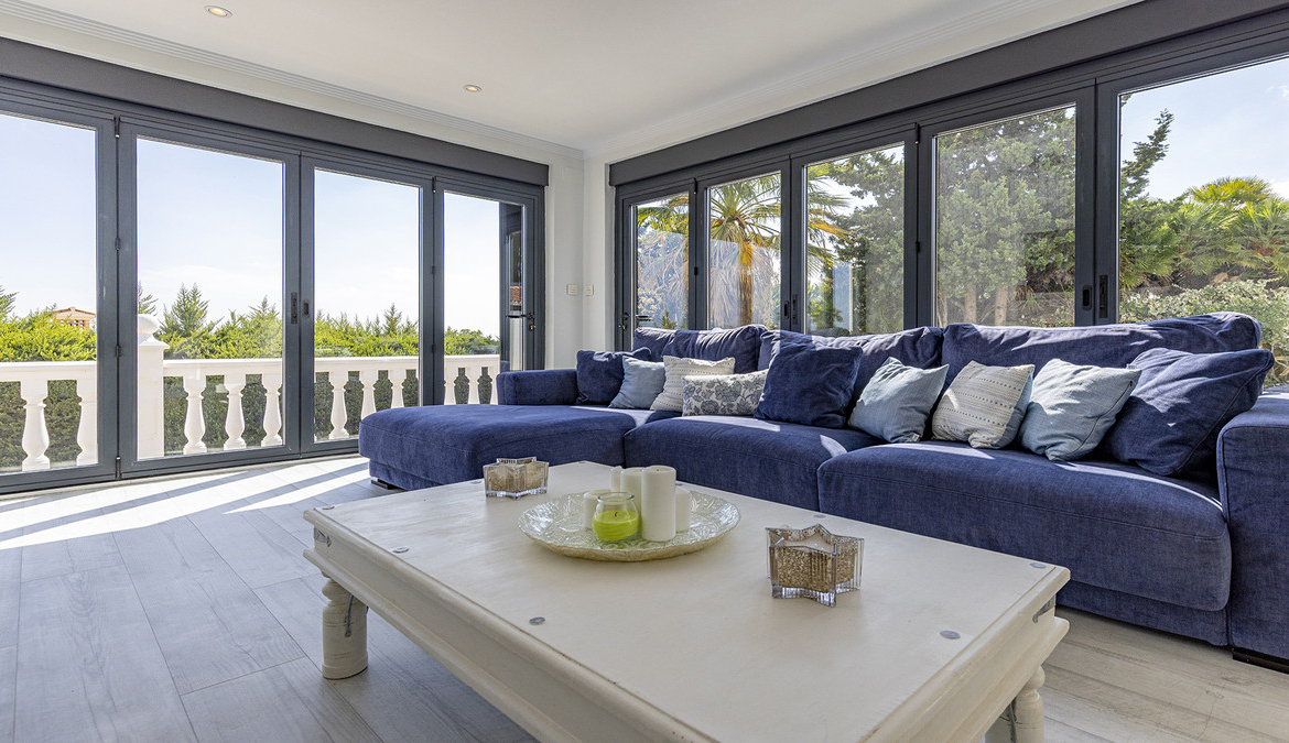 The bright and airy living area opens onto an extended conservatory-style terrace that captures sunlight from sunrise to sunset. It’s the perfect space to relax, dine al fresco, or entertain year-round while enjoying the views and natural light.