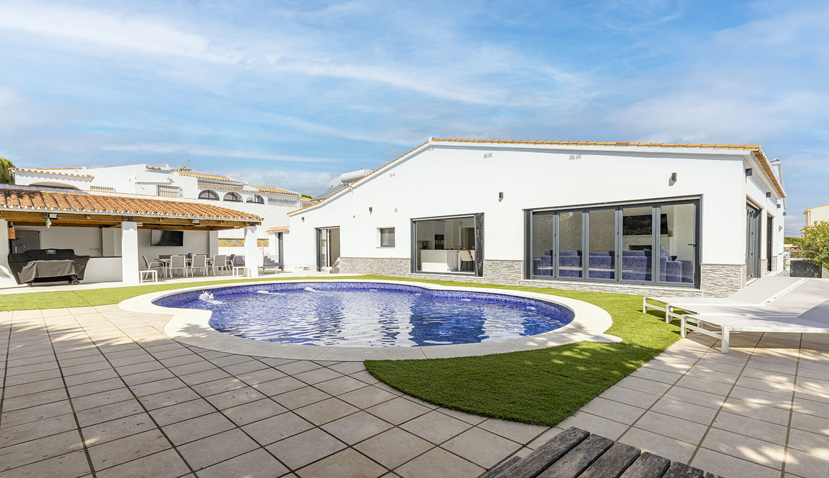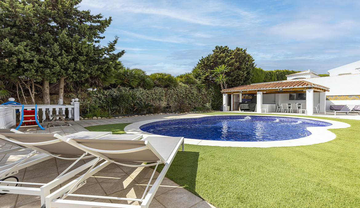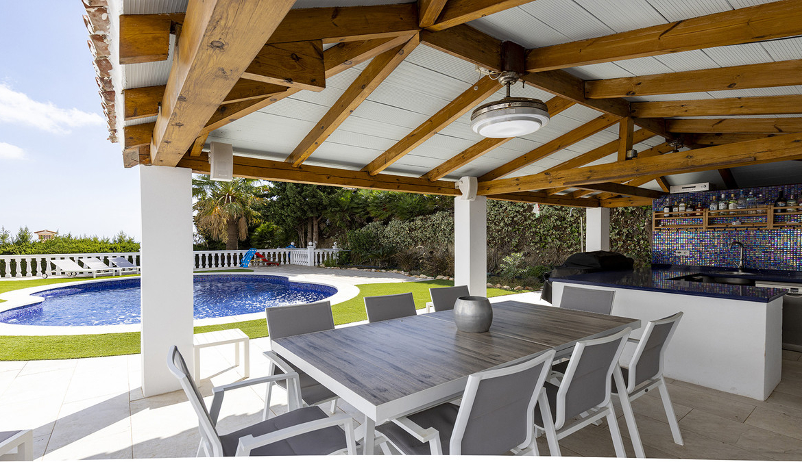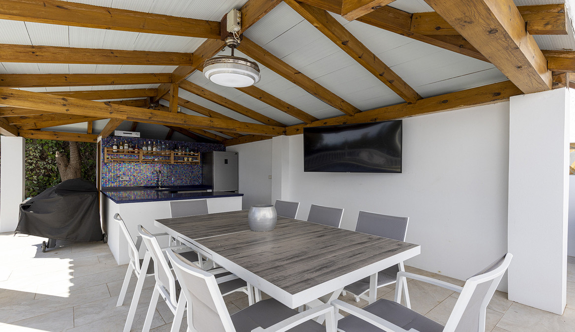 Outside, the villa truly shines with its private swimming pool, outdoor bar, and summer kitchen—creating a wonderful setting for gatherings or simply unwinding under the Mediterranean sun. The terrace area also includes an external shower and toilet, while the large lower garden offers even more space for lounging or personal landscaping projects.