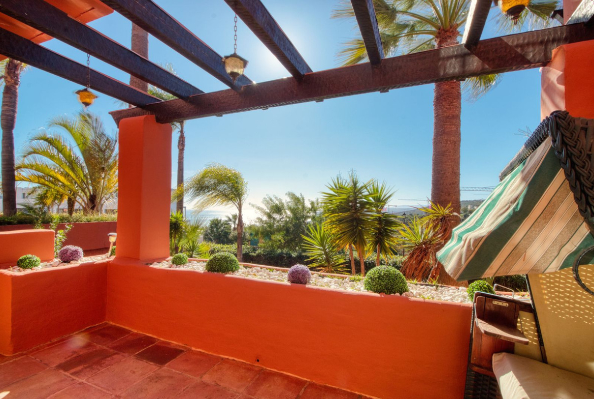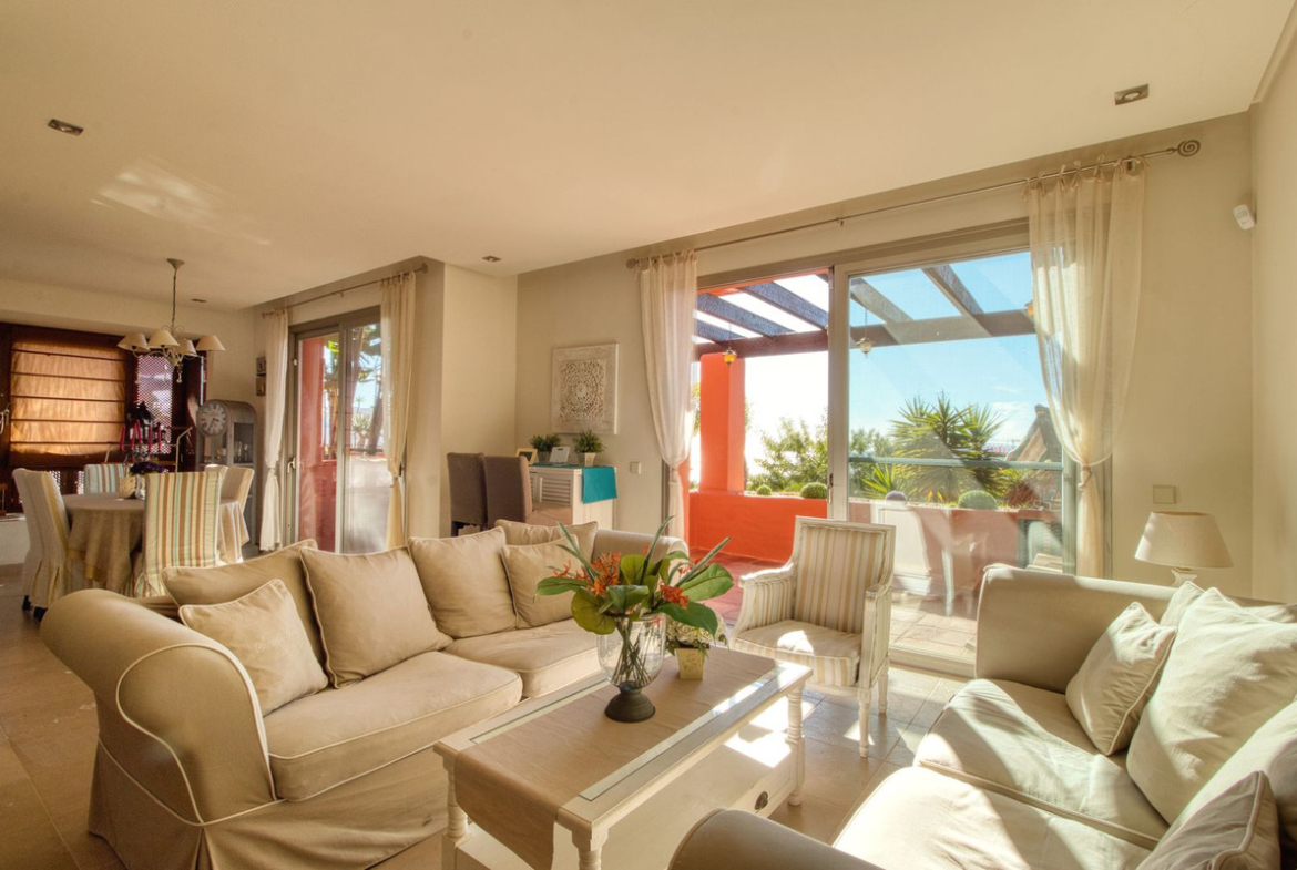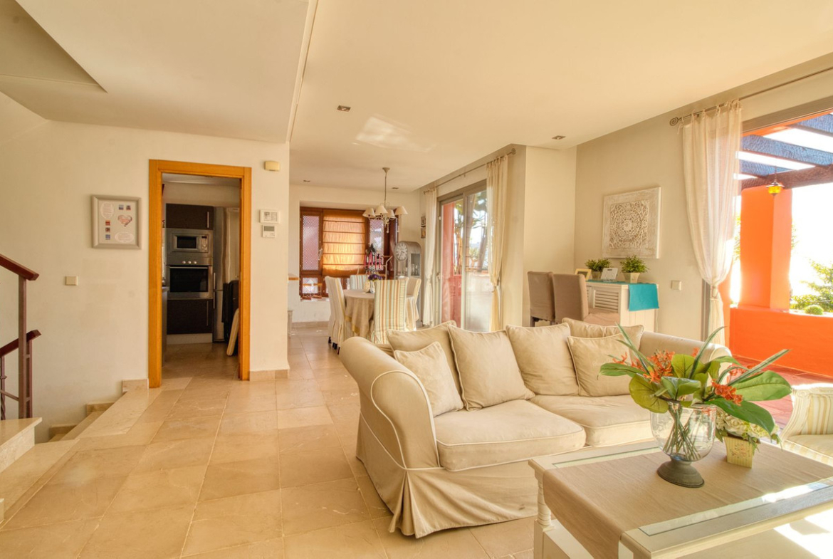 The ground floor features a large and bright living and dining area, a fully equipped kitchen, and direct access to a spacious terrace, perfect for outdoor dining and relaxation. On the first floor, the property offers three bedrooms and two bathrooms, one of them en-suite. The master bedroom enjoys a private balcony with stunning sea views. Two of the three bedrooms benefit from beautiful sea views towards Gibraltar and the African coastline.
