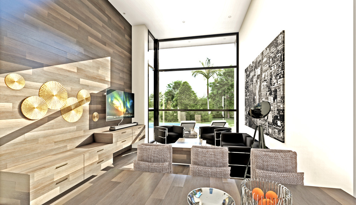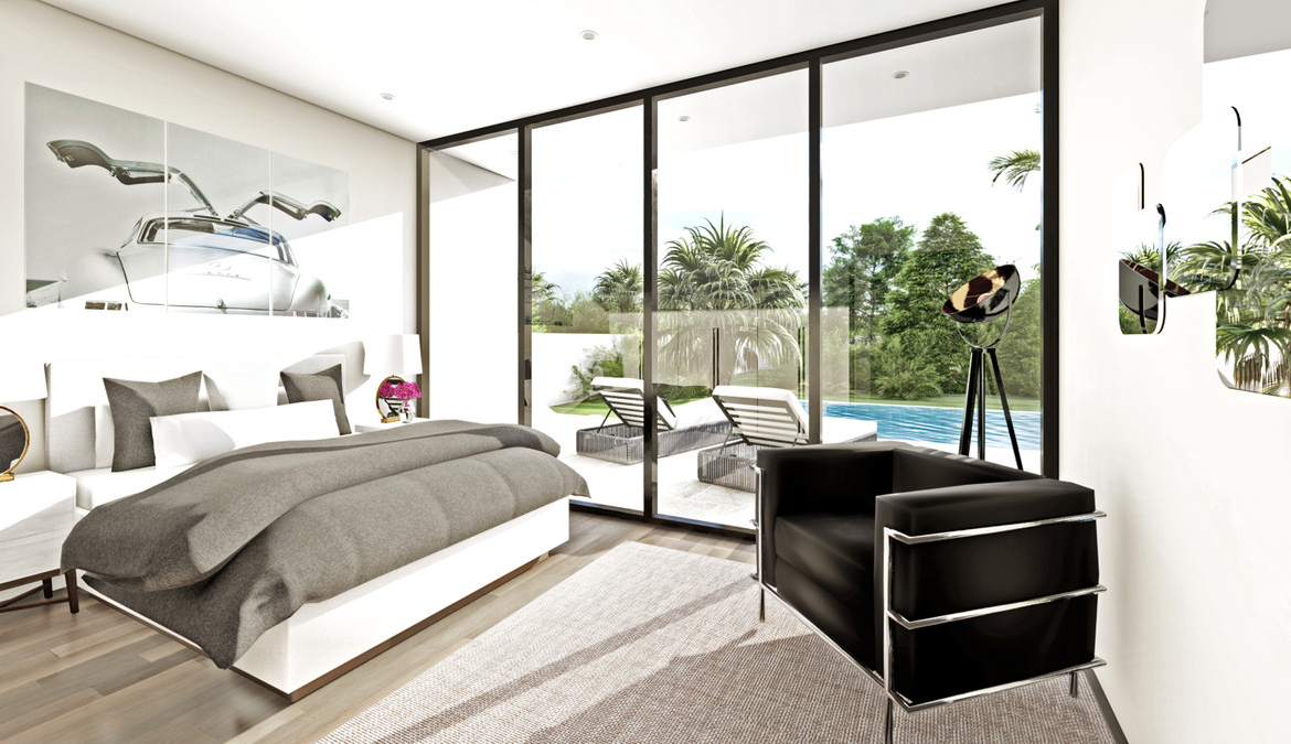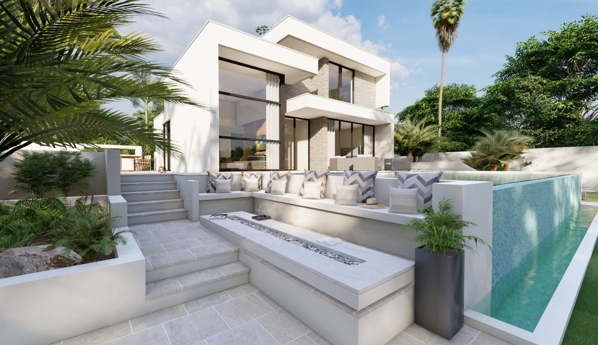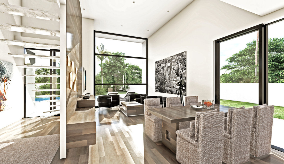 Design excellence and German-engineered quality — place it on your own plot or let us help you find the perfect one. This modern two-storey villa concept offers elegant, contemporary living with a bright open-plan layout. The design features a modern façade and a double-height living area with expansive windows that bring in abundant natural light and connect seamlessly to the outdoor terrace and pool area.
