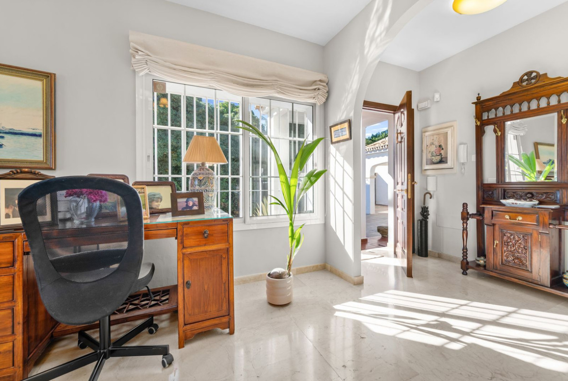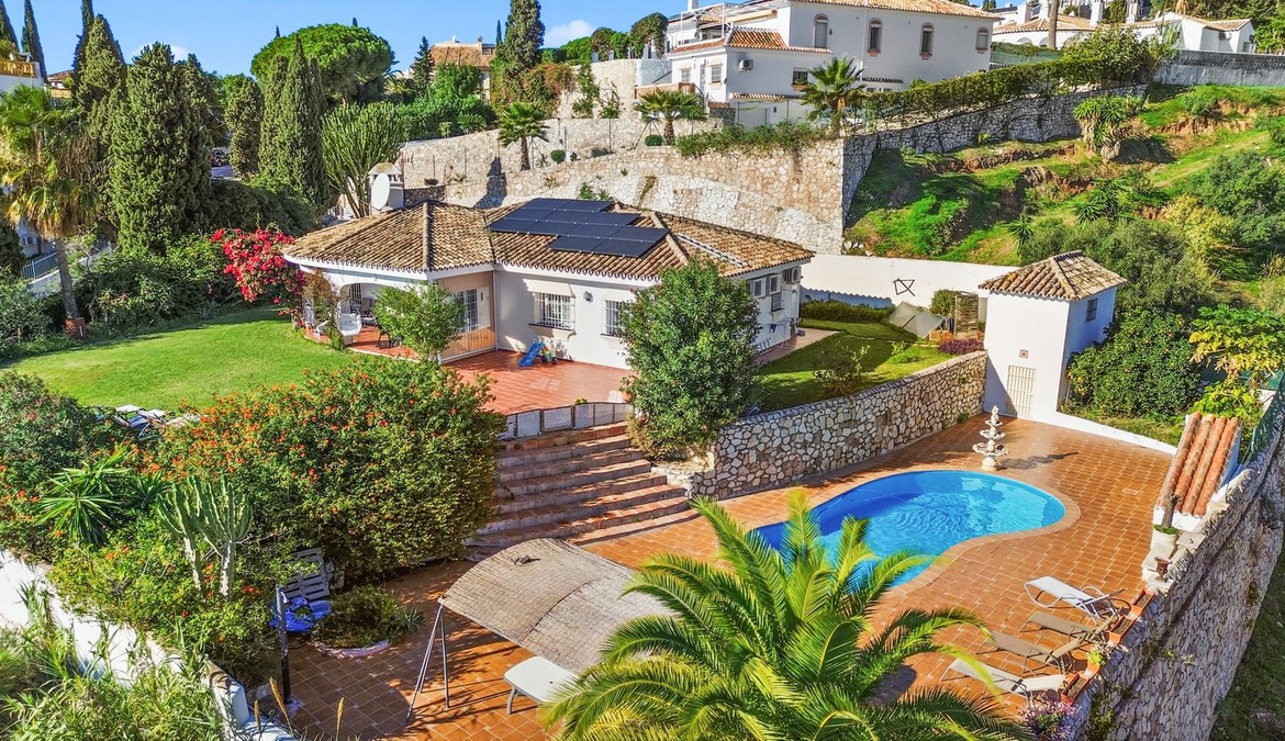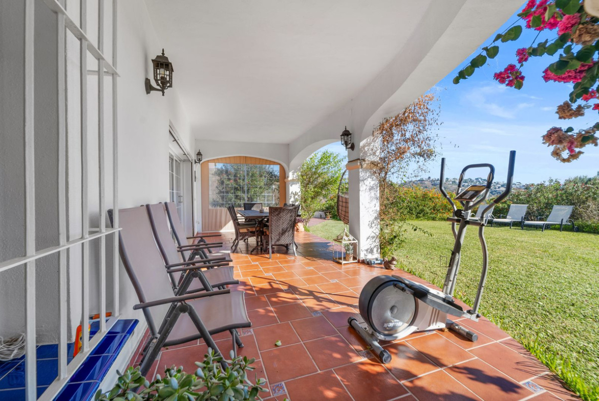 Discover this beautifully presented single-level villa set in the peaceful and prestigious Mijas Golf area. Positioned on an impressive 1,150 m² plot, this home offers outstanding outdoor living with spacious terraces, a fully equipped outdoor kitchen, lush Mediterranean gardens, private garage and a generous sun-drenched pool area ideal for entertaining or simply relaxing in complete privacy.