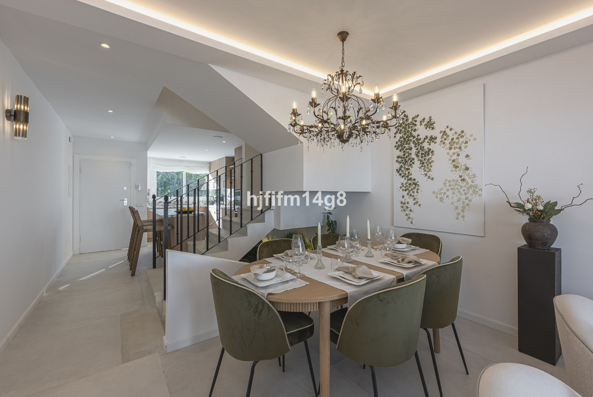 We are delighted to present this stunning, fully refurbished 4-bedroom townhouse located in the sought-after San Javier urbanisation in Nueva Andalucía, within the prestigious Marbella area. Set in a charming and very intimate residential community of just 28 properties, featuring beautifully landscaped gardens and a communal swimming pool, this home offers an ideal combination of comfort, style, privacy and prime location. Situated just behind Aloha Golf Course in a quiet cul-de-sac (not roadside), the property ensures calm and tranquillity while remaining within walking distance of restaurants, shops and the renowned Aloha College. Puerto Banús and the beaches are only a 5-minute drive away, with excellent connectivity to all local amenities.