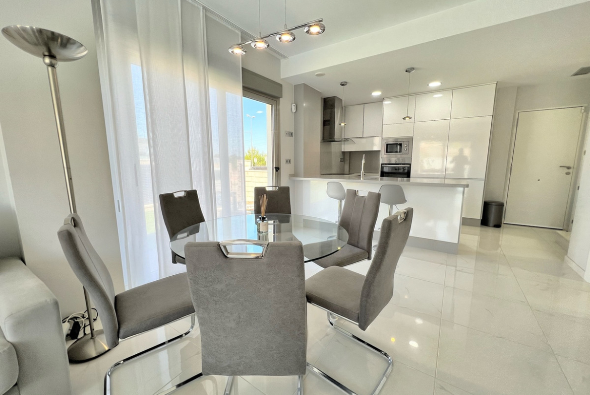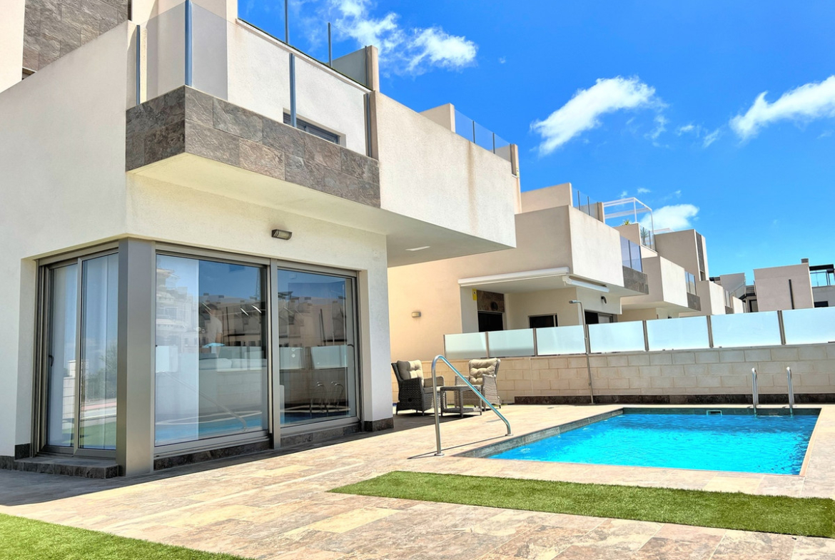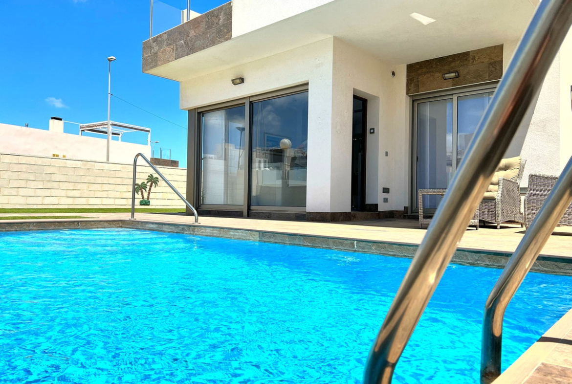 Beautiful detached villa only 400 meters from punta prima beach and close proximity to supermarkets, restaurants, shops and numerous world class golf courses. Built over two levels this modern 3 bedroom, 3 bathroom villa is set on a 234m2 plot with a 3×6 private swimming pool, secluded terrace accessed from the upper level along with the stunning solarium boasting panoramic views across the pine forest and pink salt-lake. The property has an open plan living and dining room with an American style kitchen and breakfast bar. The lower level of the villa also has a guest bedroom and bathroom along with a utility room and storage cupboard. On the upper level of the villa you will find 2 big bedrooms both with en-suite bathrooms and access to the sun terrace. The property is sold with many extras including air-conditioning. Viewing recommended.