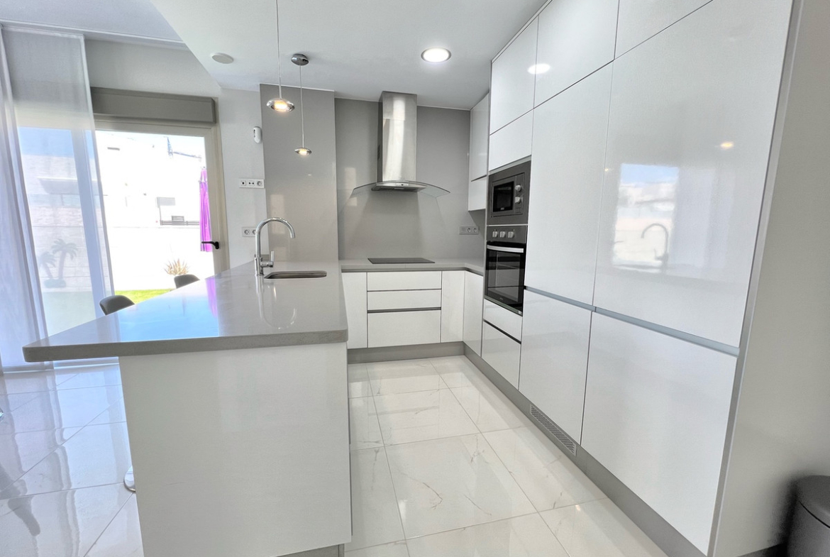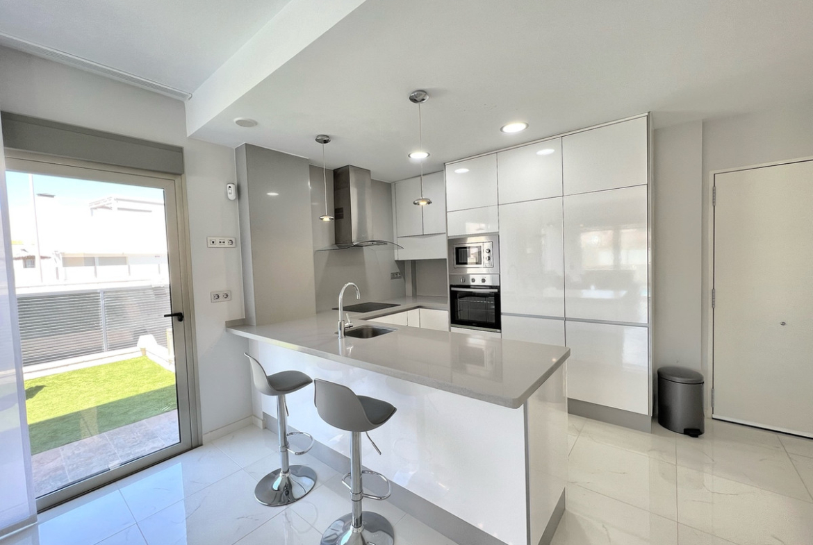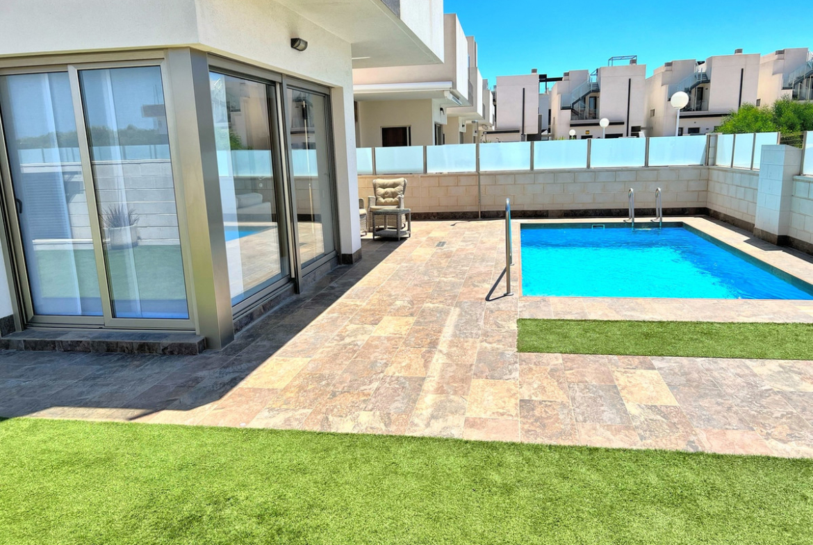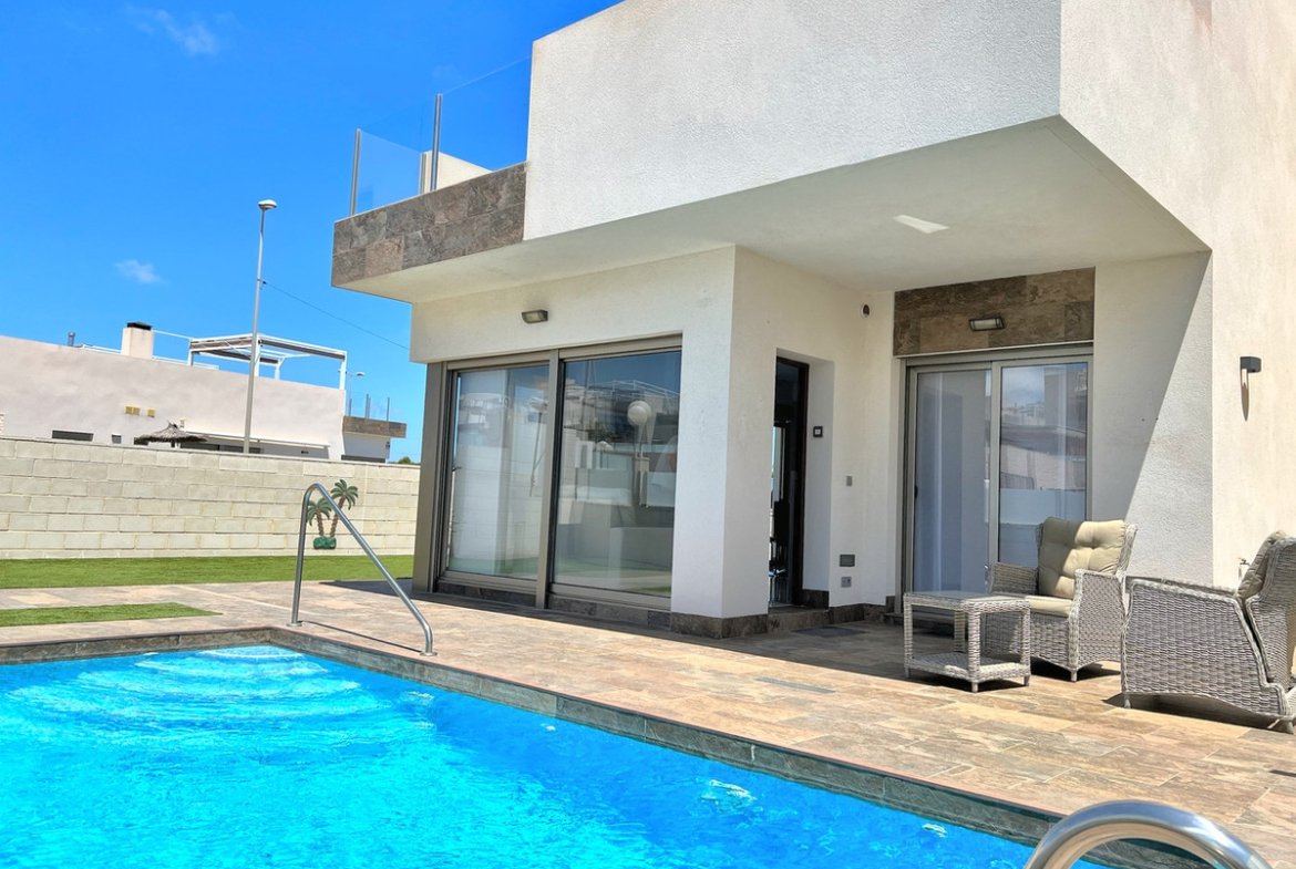 Beautiful detached villa only 400 meters from punta prima beach and close proximity to supermarkets, restaurants, shops and numerous world class golf courses. Built over two levels this modern 3 bedroom, 3 bathroom villa is set on a 234m2 plot with a 3×6 private swimming pool, secluded terrace accessed from the upper level along with the stunning solarium boasting panoramic views across the pine forest and pink salt-lake. The property has an open plan living and dining room with an American style kitchen and breakfast bar. The lower level of the villa also has a guest bedroom and bathroom along with a utility room and storage cupboard. On the upper level of the villa you will find 2 big bedrooms both with en-suite bathrooms and access to the sun terrace. The property is sold with many extras including air-conditioning. Viewing recommended.