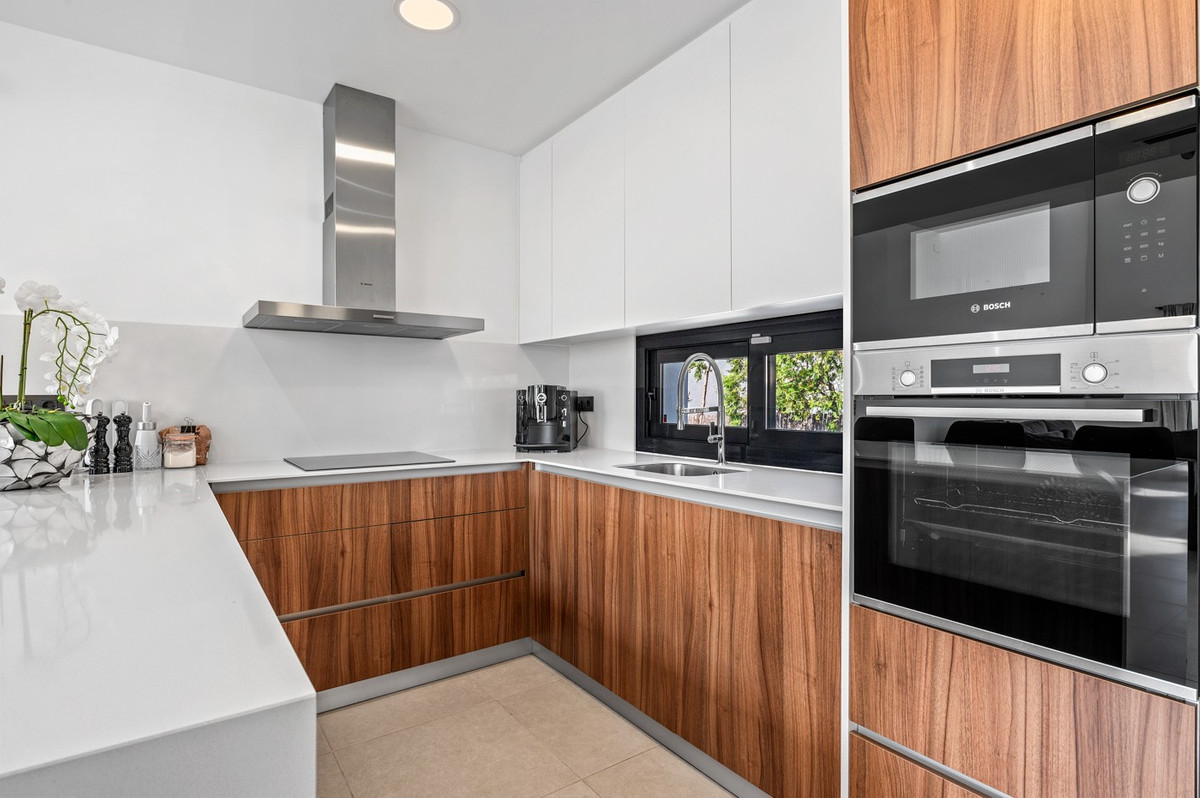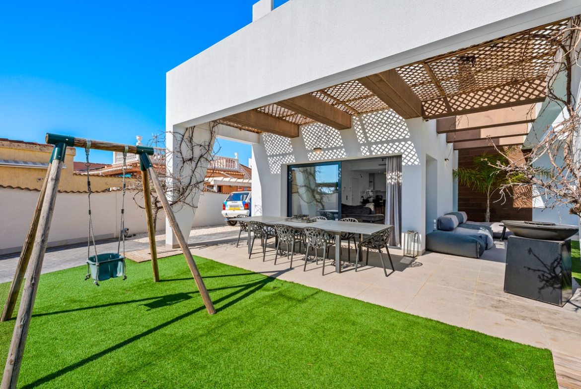 This modern, south-facing villa for sale in Ciudad Quesada on the Costa Blanca was built in 2020 and is in excellent condition. The property combines contemporary architecture with comfort and functionality, making it perfect as a permanent residence, a luxury holiday home, or an attractive rental investment. Thanks to its central yet peaceful location, within easy reach of all amenities, you'll enjoy an ideal balance between privacy and accessibility. The villa stands on a private plot of 533 m² and offers 153 m² of living space spread over three levels. Upon entering, you'll immediately notice the bright and open living space, where the living room, dining area, and modern open-plan kitchen seamlessly flow together. Large windows provide abundant natural light and create a direct connection to the garden and private saltwater pool. The kitchen is equipped with high-quality built-in appliances and connects to a practical separate laundry room. This floor also features a stylish guest bedroom and a fully equipped bathroom, offering additional comfort for visitors or ground-floor living. The first floor features two spacious bedrooms, both with en-suite bathrooms. One bedroom boasts a walk-in closet, while the other has direct access to a private balcony overlooking the garden and pool. The top floor offers a versatile additional space that would be perfect as an office, studio, or fourth bedroom. From here, you can access two generous terraces with panoramic views of Ciudad Quesada, the surrounding countryside, the salt lakes, and even a partial view of the Mediterranean Sea. The outdoor area is designed to optimally enjoy the Mediterranean climate and requires little maintenance. The L-shaped saltwater pool is the focal point of the garden and is surrounded by several terraces where you can relax or dine al fresco. The fully enclosed plot also includes a private driveway with secure parking. Additional comfort is provided by hot and cold air conditioning, underfloor heating in the bathrooms, solar panels, double glazing, and a favorable energy label B, which contributes to energy-efficient living. The villa is situated in a quiet cul-de-sac just minutes from the center of Ciudad Quesada, where you'll find a wide range of restaurants, cafes, shops, and supermarkets. This popular residential area is known for its international atmosphere and excellent amenities, including golf courses, hiking trails, and recreational opportunities for the whole family. The beaches of Guardamar del Segura are about a ten-minute drive away, while La Marquesa Golf is a short distance away for golf enthusiasts. Alicante Airport is also easily accessible, making this location particularly attractive for both permanent residence and holiday use. This move-in ready modern villa in Ciudad Quesada offers a combination of luxury, space, privacy and a prime location on the Costa Blanca, making it a unique opportunity for those seeking comfortable living under the Spanish sun.