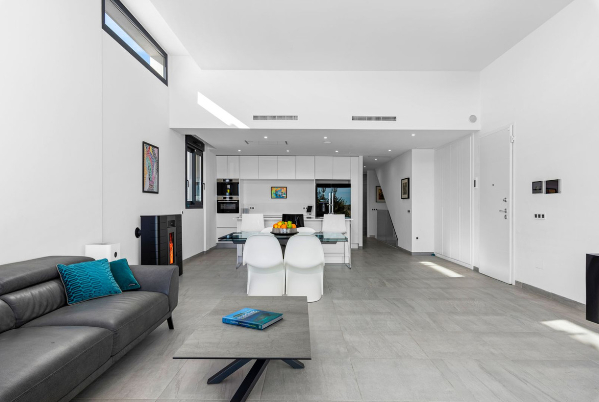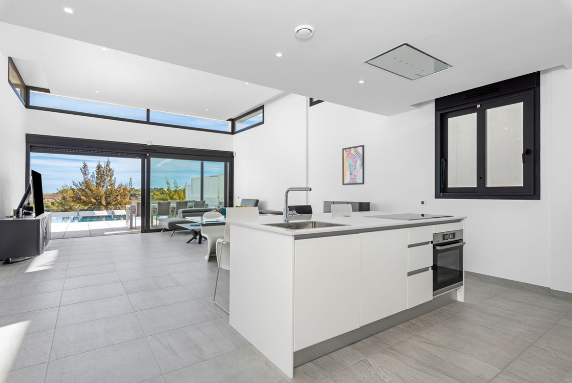 As we enter the villa straight into the open plan kitchen/living room you will immediately notice how bright and spacious it is. The 60m² living area has a raised ceiling of 3.5m and has large panoramic sliding doors across the back, which allows you to fully enjoy the amazing sea views. The doors lead out to a large covered terrace and the beautiful newly fitted heated infinity pool with lights and electric cover. Down a few steps to the back of the pool there is a cosy deck where you can sunbathe until the sun goes down. Back inside to the sleek modern kitchen you will be wowed by the technology this villa has. All the appliances are top of the line and can be controlled by your phone, through WiFi Home Connect. That includes the built-in oven, microwave, dishwasher, induction hob, extractor fan and even the coffee machine! All appliances that are built in, will remain. There is even a hidden pop-up plug stand built into the island. Beside the front door are hidden storage cupboards, ideal for coats, shoes and much more.