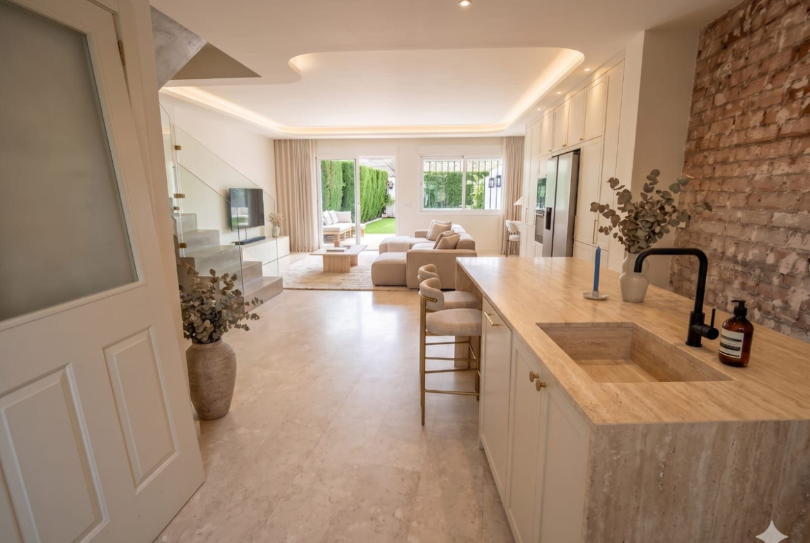 Wonderful townhouse only five minutes walking to the beach of San Pedro and Puerto Banus. This townhouse is on a semi corner giving out to a park and pedestrian path and is very privately situated. It sits in a secure urbanisation with two community pools and lovely gardens. The townhouse is being refurbished so for quick buyers it will be temporarily available for the above mentioned price, but it will change soon when they start construction, so its a rare opportunity to find something so close to the beach for this price.