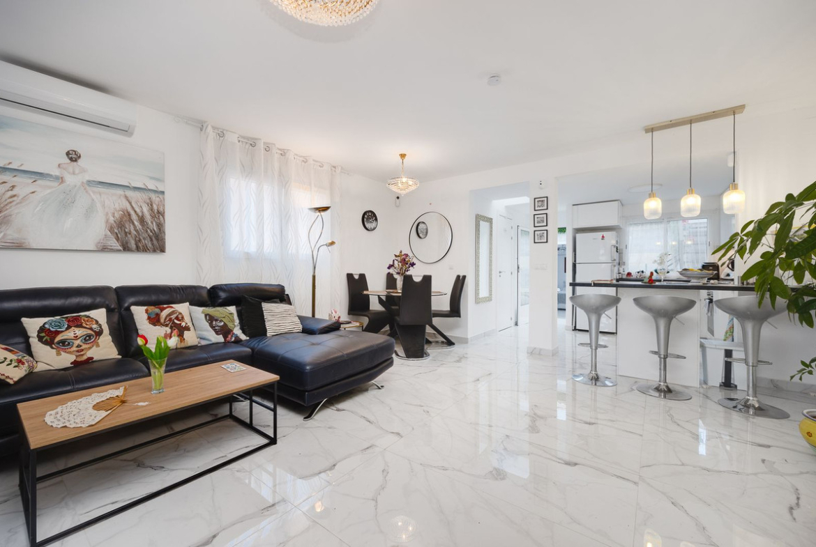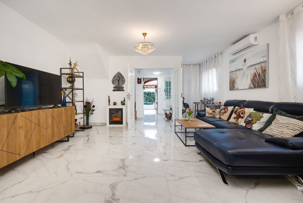 This semi-detached house is spread over two floors with a practical and comfortable layout. The fully renovated ground floor features a spacious living-dining area with an open-plan kitchen, one bedroom, a bathroom with a shower, and a covered porch leading to a private terrace—perfect for soaking up the Mediterranean climate. Upstairs, you will find three bedrooms (one double and two singles) and a second bathroom.