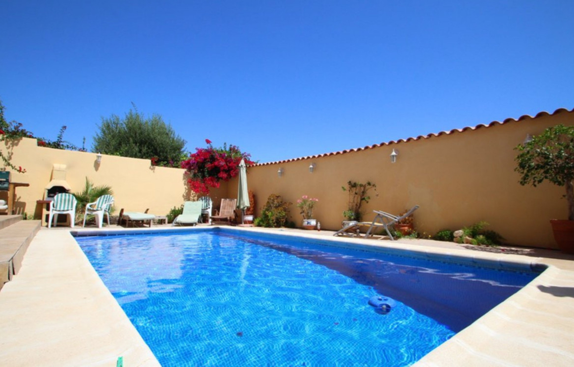 This beautiful family home offers in the main living area three double bedrooms, family bathroom, toilet, cloakroom, spacious lounge/dining room, fully fitted kitchen with breakfast bar and storage area. The villa also boasts a private under build apartment with direct access to the pool area and offers double bedroom, spectacular bathroom, sleek and modern open plan kitchen with breakfast bar and spacious lounge/dining area. Outside space boasts numerous terraces, wrap around balcony, established garden and private swimming pool (8×3). To be sold furnished including white goods, security shutters, grilles, air conditioning, satellite TV, gas fire and much more.