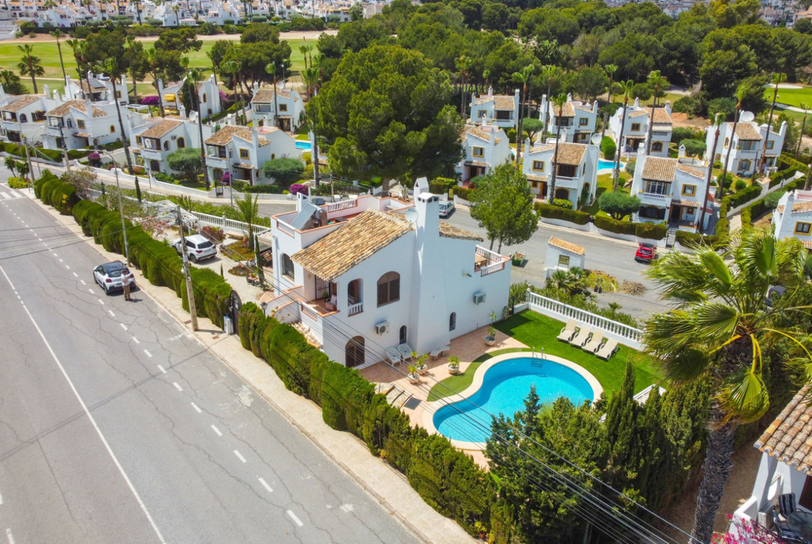 The villa is spread over two floors and has a total of four spacious bedrooms and two bathrooms, making it ideal for large families, multi-generational living or those simply looking for plenty of space to enjoy life in the sun. With a built area of 156 square meters on a generous plot of 900 square meters, there is both space and privacy here – an oasis in the middle of the green.