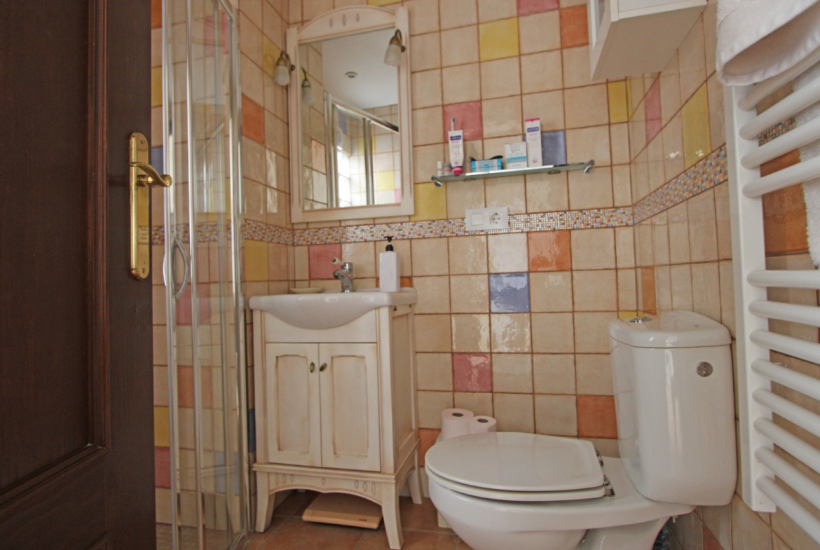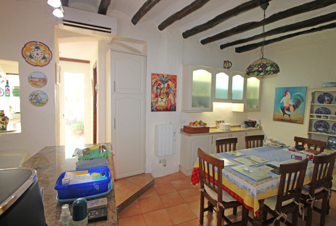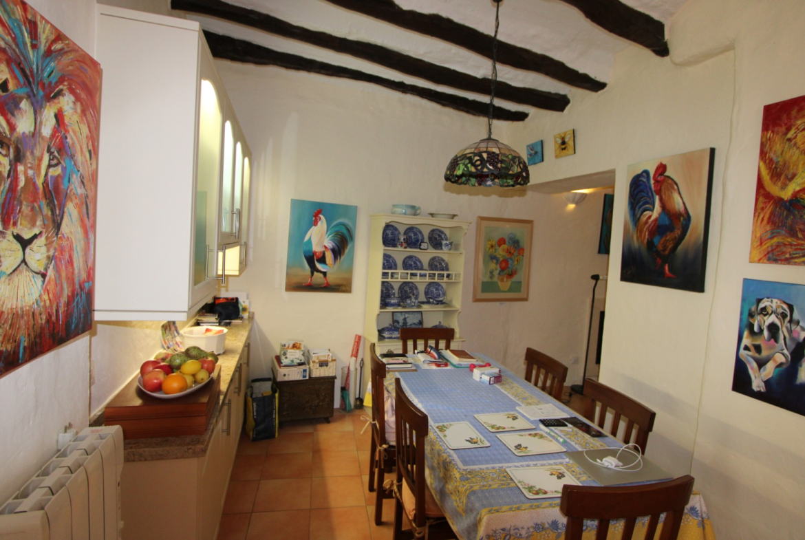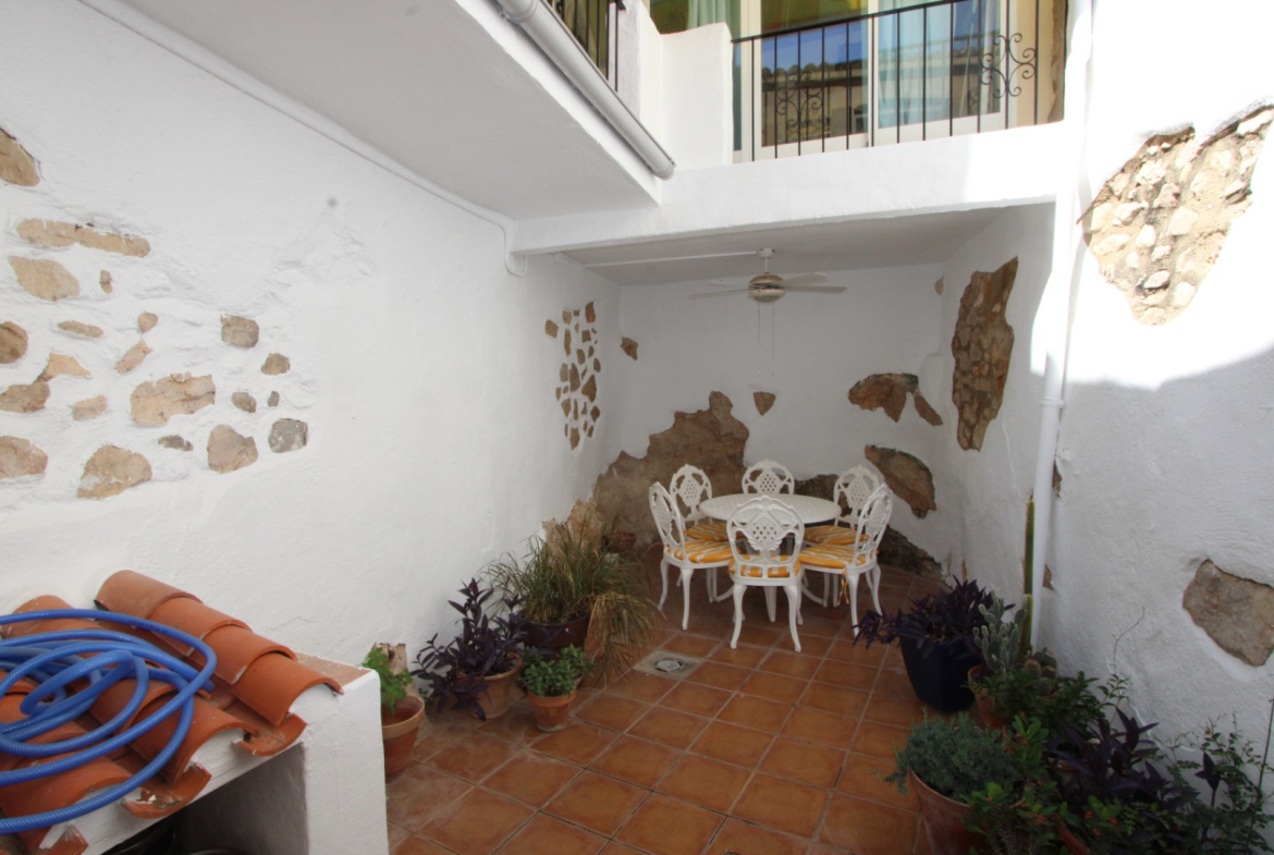 This beautiful townhouse, full of character, is situated in the centre of the typical Spanish village of Tormos is entered through large wooden doors into a living room with high ceilings, typical of the traditional casas de pueblos . There is also an additional living room with a new pellet burner . This room also benefits from a ceiling fan. There is a fully fitted kitchen and utility room with a separate dining room with a new A/C unit. On this level there is also 1 bedroom fitted with a ceiling fan, a shower room and a large store room under the stairwell. Patio doors from the utility room lead to a beautiful courtyard with a covered area set up for alfresco dining on the warm summer Spanish evenings evenings. On the upper level is a landing used as an additional living room with a further 3 bedrooms radiating from it and a family bathroom. All of the bedrooms have A/C units fitted. On this level is an open terrace which leads to an additional room now used as the owners studio, but could also function as an office or a single bedroom. This room also has an A/C unit fitted. This jewel of a property has been modernised by the present owners but they have maintained and improved both its charm and character. This beautiful town house would be ideal as either a permanent or holiday home