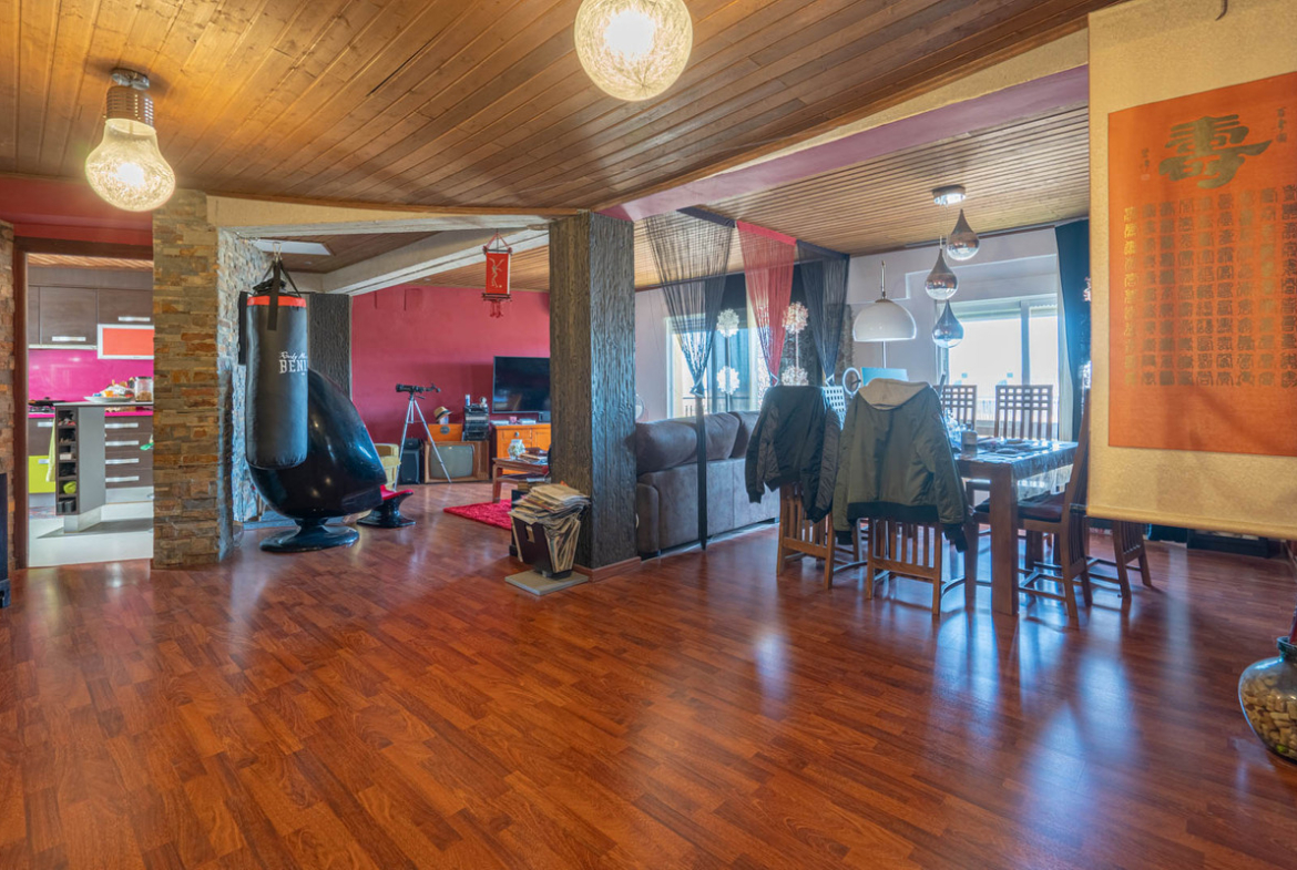 This spacious 178 m2 flat is located on the fourth floor of a small apartment building on the outskirts of Javea town centre. Thanks to its central location, you can reach all the facilities in the old town centre as well as the beach and the port on foot. This property consists of two joined flats so you will be the sole occupant on the fourth floor. You enter the flat into a spacious living-dining room. Through the sliding windows, there is access to a balcony facing south. Adjacent is the kitchen with a kitchen island. From the living room, a corridor leads to a double bedroom with a second balcony, an office space where several windows provide plenty of natural light and a small balcony facing west, a spacious bathroom (currently under renovation), a bedroom and a laundry room. On the other side of the living room is a second corridor with a bathroom and two double bedrooms. Both from the living room and from two bedrooms you can enjoy views over the bay of Javea. One floor up is a very large communal roof terrace with 360° panoramic views of the sea, the Montgó and the village.