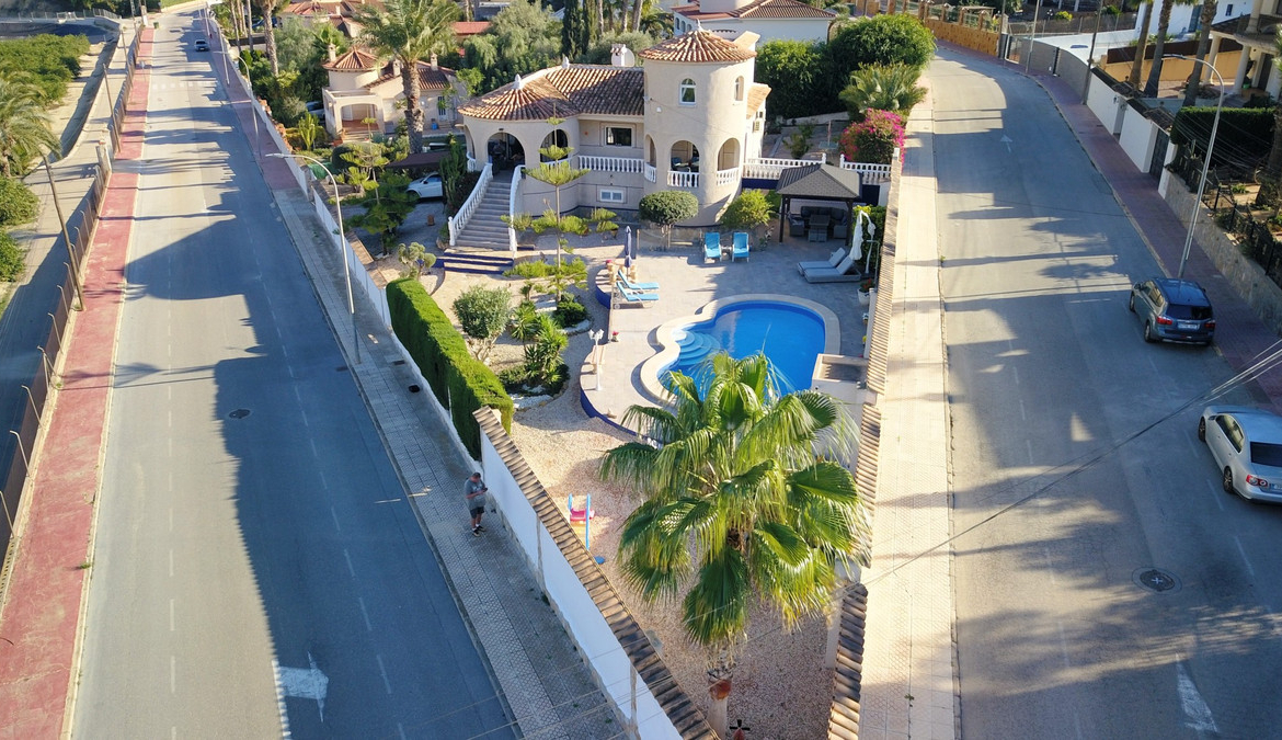 This Remarkable, West Facing, Corner, Five Bedroom Detached Villa in Lomas de La Juliana is located in a prominent position on the Costa Blanca South, under the area of Almoradi but closer to and conveniently situated between Algorfa village and the prestigious La Finca Golf, Hotel & Spa Resort. With a tennis club just at the top of the road and main brand amenities only a few minutes’ drive away, the blue flag beaches of Guardamar del Segura are also just 15 minutes away! This incredible property spans an impressive 375m² build size on a stunning 1,149m² plot, offering panoramic views of the countryside, citrus groves, mountains, and sunsets. The main villa has been fully updated and modernized, retaining its character and charm, and includes three bedrooms and three bathrooms. Upon entering, the hallway leads to an open-plan, fully fitted kitchen with a breakfast bar, a spacious family-sized living room with a cozy log-burning fireplace, and direct access to the large front covered terrace, perfect for appreciating the breathtaking views. There’s also a dining room with rear garden access, a shower room, and two bedrooms on the ground floor, one with an en-suite bath and shower. The upper-level master bedroom features a walk-through wardrobe, dressing table, and an en-suite shower room. The separate annex, located in the under-build, provides two additional bedrooms and a bathroom, accessed via the double garage or independently from the rear. This space includes a separate kitchen and dining area, a large bedroom with a living area and office, plus an en-suite shower. The garage is currently used as a games room with a pool table, ping pong, utility space, and an adjoining storeroom. Outside, the gravelled and tiled garden features an updated private swimming pool, a BBQ area, a small putting green, and ample space for outdoor dining and entertaining. Additional highlights include a carport, off-road parking, oil central heating, air conditioning throughout, ceiling fans, fitted wardrobes in the main villa, and dual entrances from different roads. This is an extraordinary opportunity to own a substantial and versatile property with fantastic views in an enviable location!
