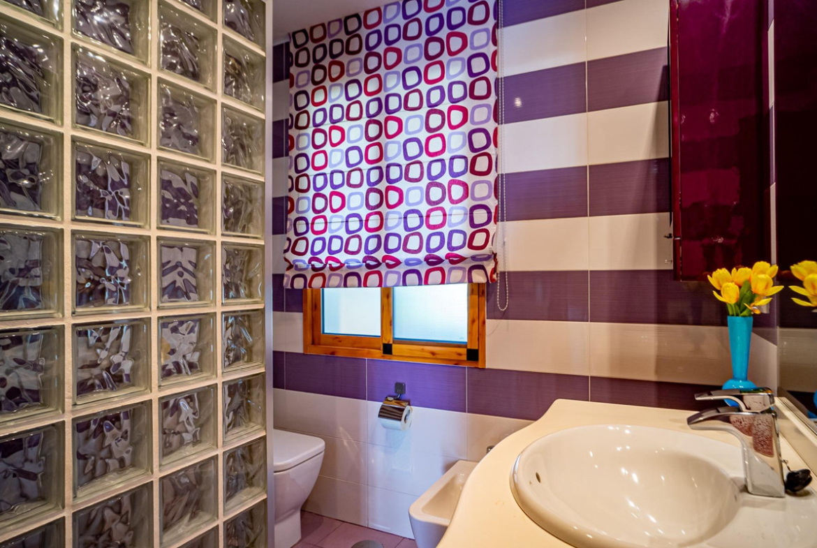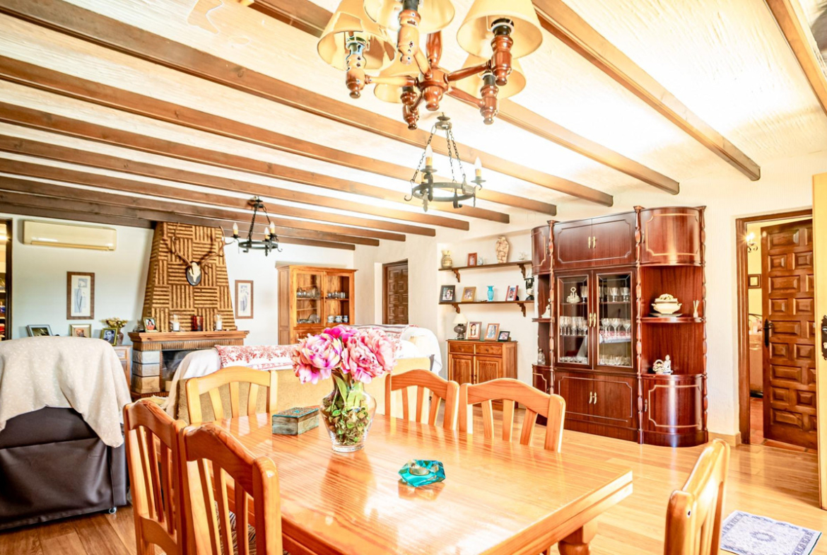 The upper floor, connected to the lower one by an internal staircase, also has its own entrance. It features an entrance hall, a kitchen, a large living room with fireplace, three bedrooms (one currently used as a walk-in dressing room), and two bathrooms. The master bedroom is spacious and includes an en-suite bathroom. From both the master bedroom and the living room, there is access to a large covered balcony offering panoramic views of the sea, Benidorm, and the mountains. From the balcony, you can access a solarium with even more impressive views.