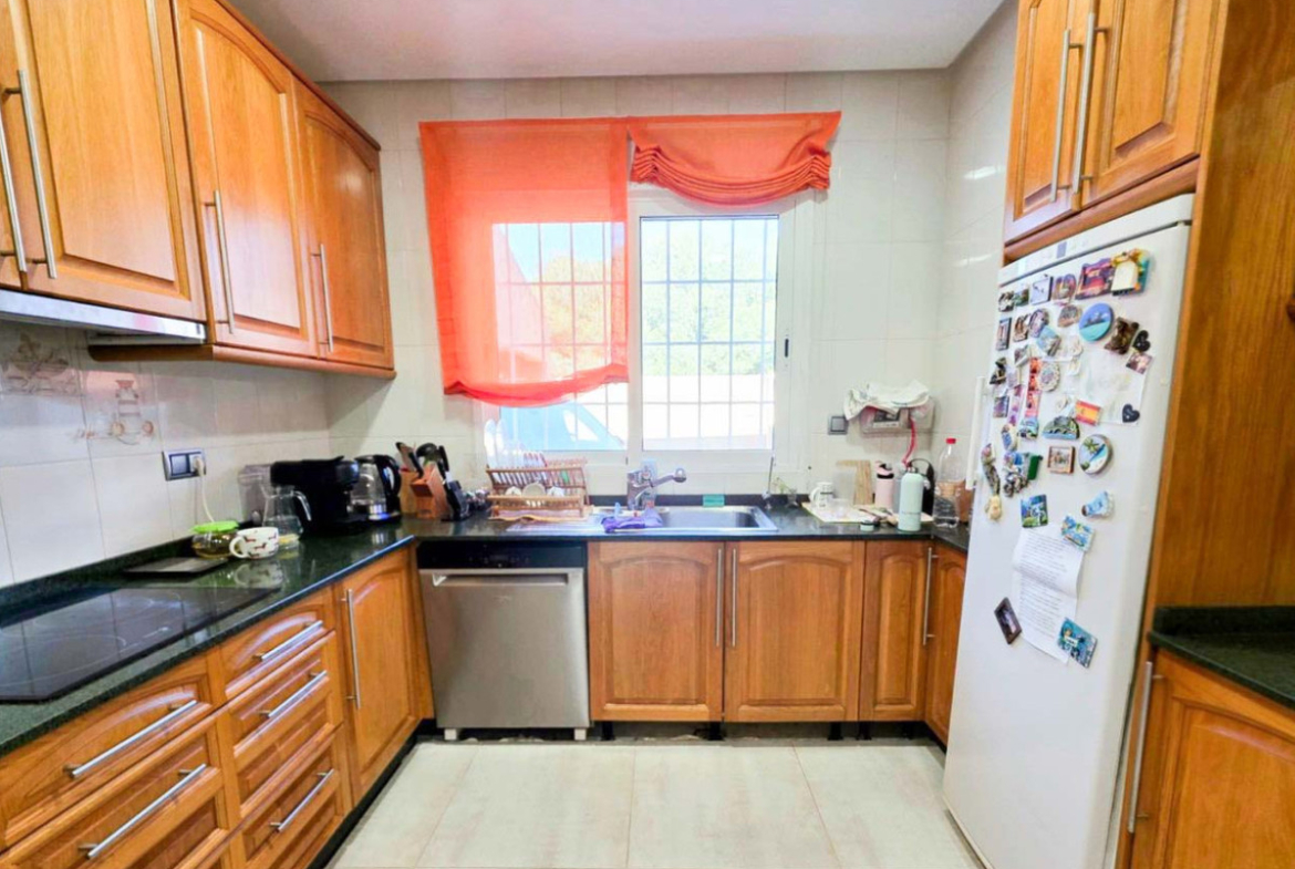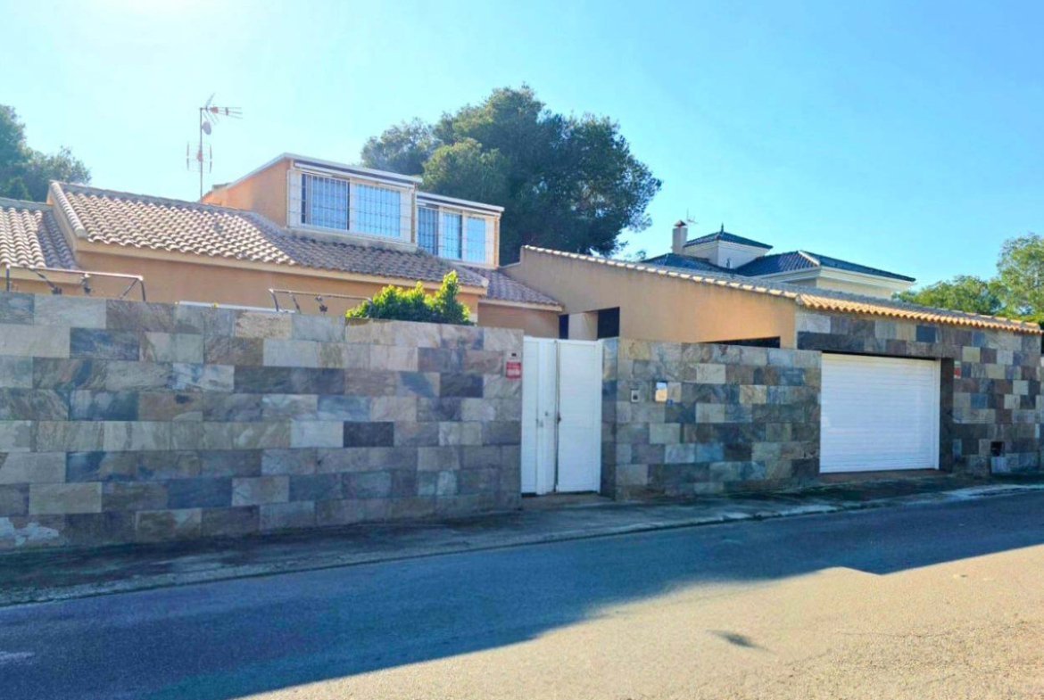 This chalet for sale in Campoamor offers 295 m² built area on a 700 m² plot, featuring a private pool, closed porch, and five air-conditioned bedrooms. Spread over two floors, the property includes a large living room with access to the closed porch that can be enjoyed year-round. It has a fully equipped kitchen, dining room, two bathrooms (one interior and one outdoor guest toilet), and a solarium to enjoy sun and views. The garden boasts a separate porch designed as a summer kitchen-dining area, ideal for outdoor gatherings. The garage accommodates three cars, providing comfort and security. Located in a peaceful area close to local amenities, this home is perfect for families or as a seasonal rental investment. Contact us to schedule an in-person visit or request a virtual tour and detailed floor plans.