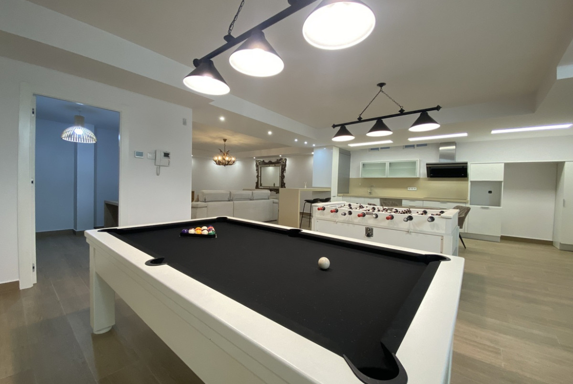 The basement unfolds into a versatile game room with billiards and table football, a spacious celebration room featuring a full kitchen, 2 bedrooms, 2 storage rooms, and a well-appointed full bathroom. The main floor showcases a seamless living-dining space with an open-concept kitchen and central island, complemented by the main bedroom with an en-suite bathroom. Additionally, a laundry room and a guest toilet enhance the practicality of this level.