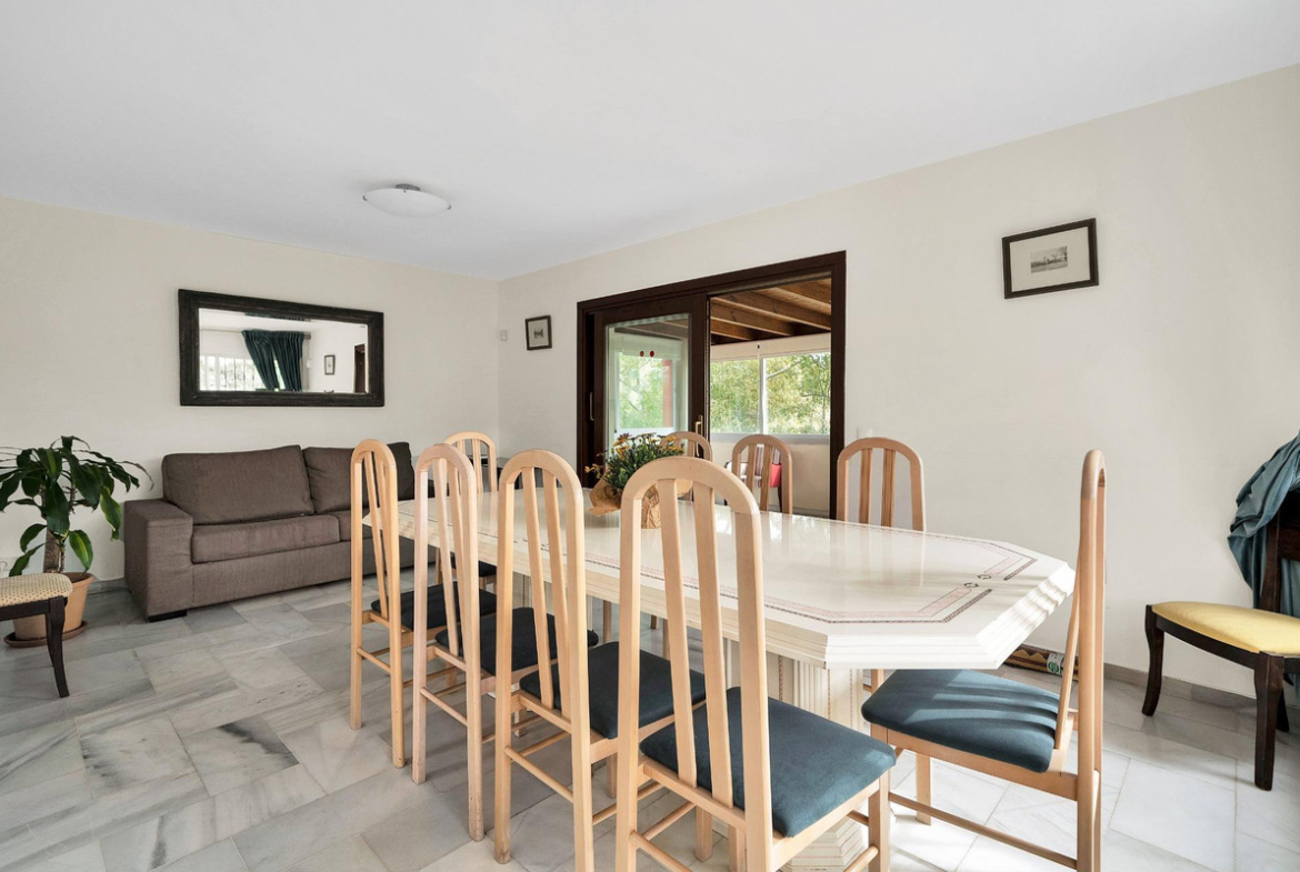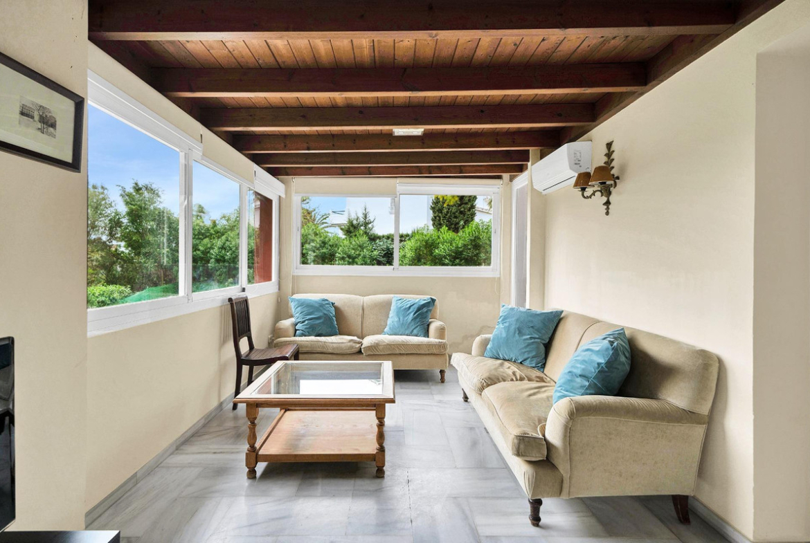 Villa located in a quiet residential area of Cerrado de Elviria, 800m from the beach, close to supermarkets and restaurants and 8km from the historic centre of Marbella.