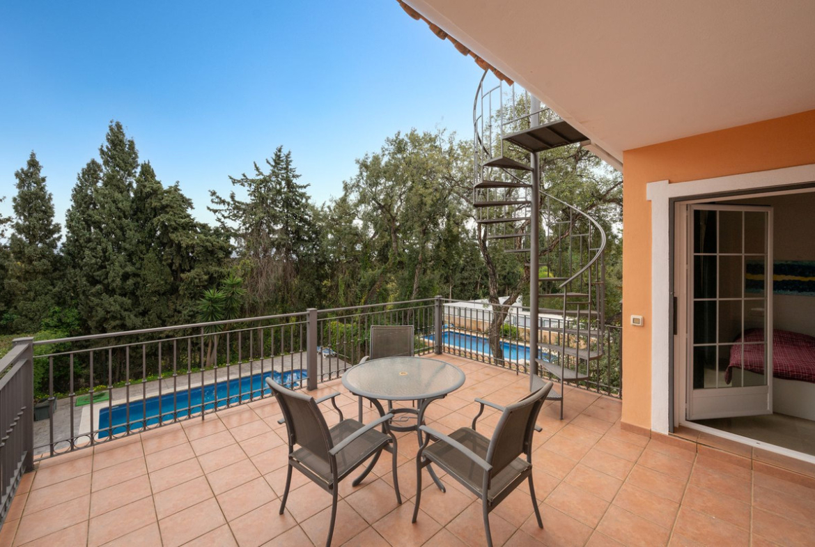 The first floor boasts with 3 more spacious and bright bedrooms, all with en-suite bathrooms and large wardrobes. One room has a balcony overlooking the garden and pool and also shares a terrace with the other bedroom. The third bedroom has views to a lovely green private park area facing West.