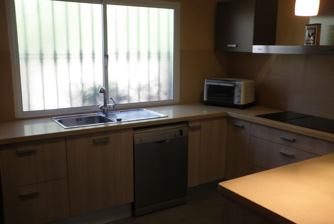 Spacious Layout Across Three Floors: Entrance hall, guest toilet, large modern fully equipped kitchen, and a generous living/dining room with direct access to a private garden and the community pool.