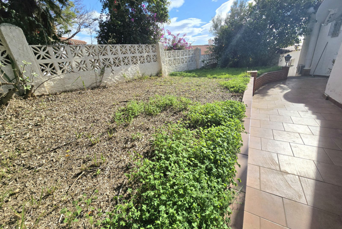 The property is surrounded by a large garden and patio, perfect for creating outdoor leisure or relaxation areas.